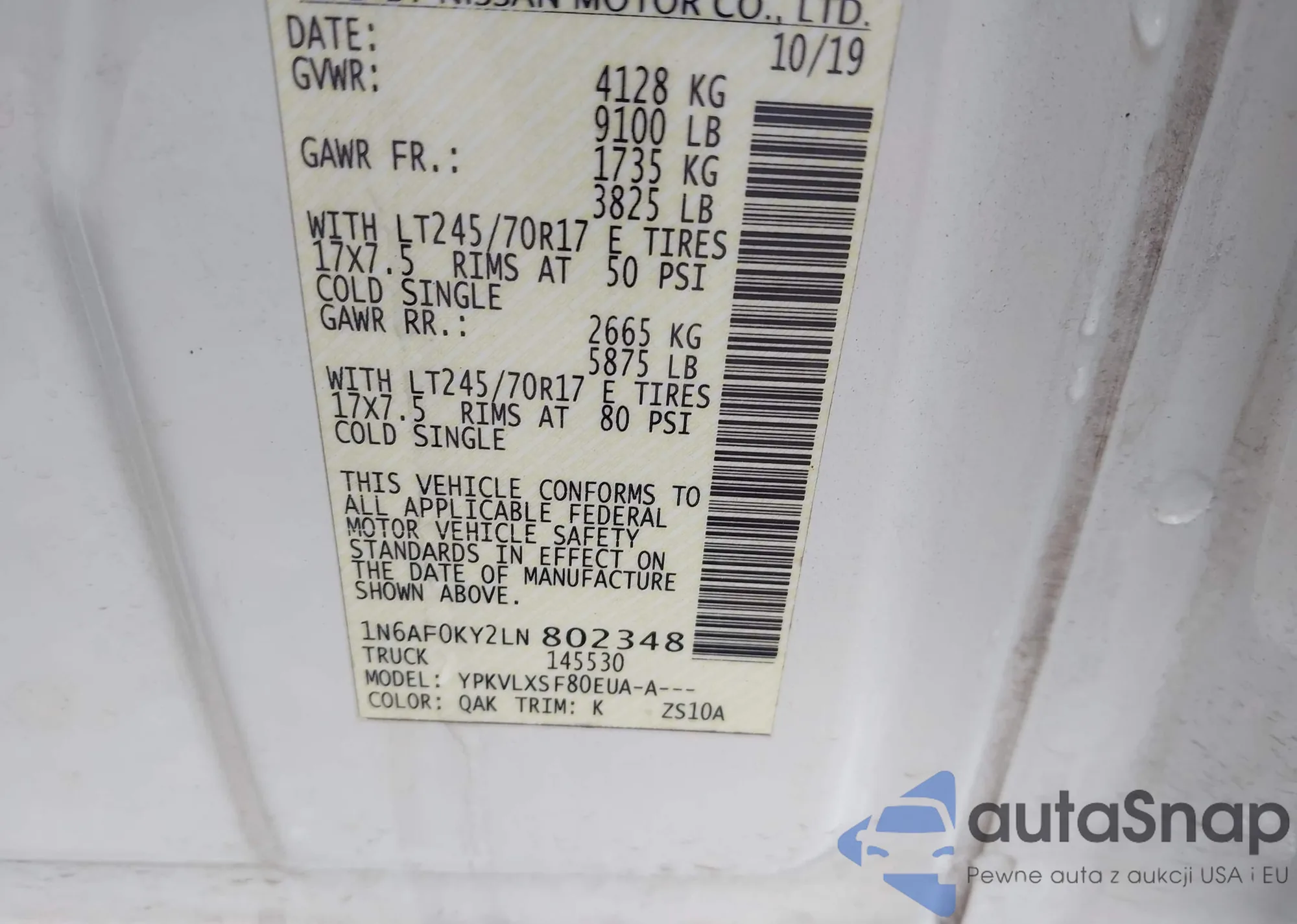 LOT: 43383505 VIN: 1N6AF0KY2LN802348
