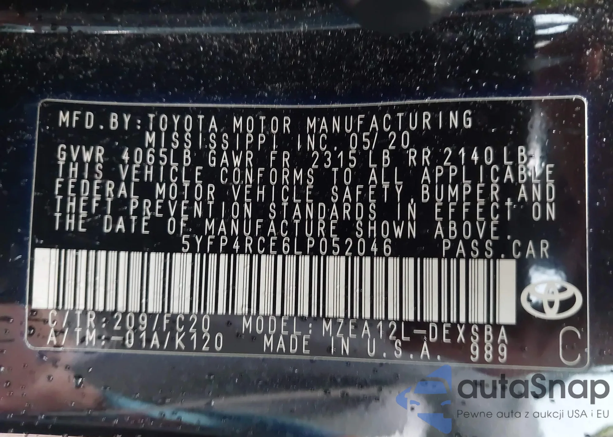 LOT: 43393327 VIN: 5YFP4RCE6LP052046