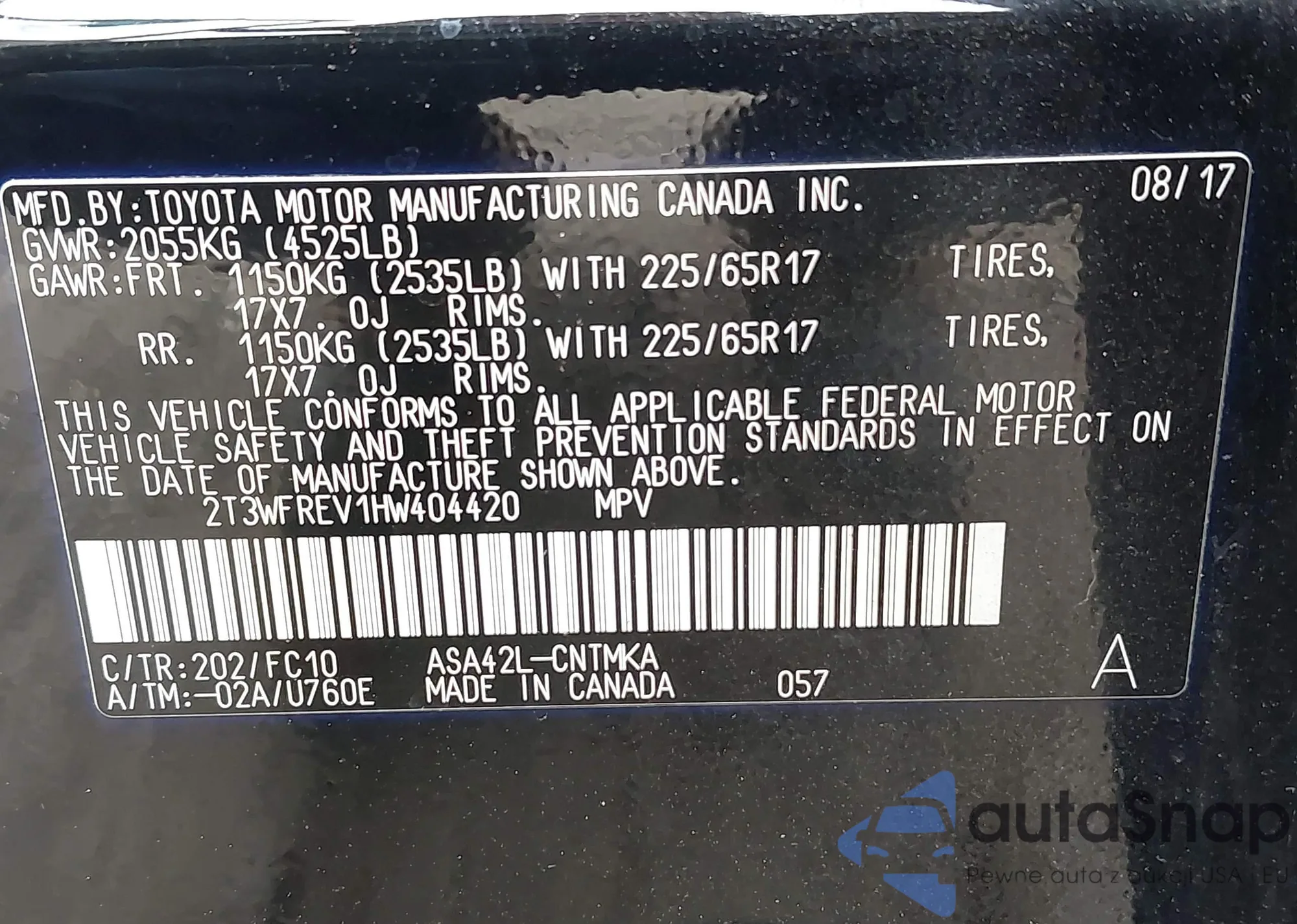 • VIN 2T3WFREV1HW404420