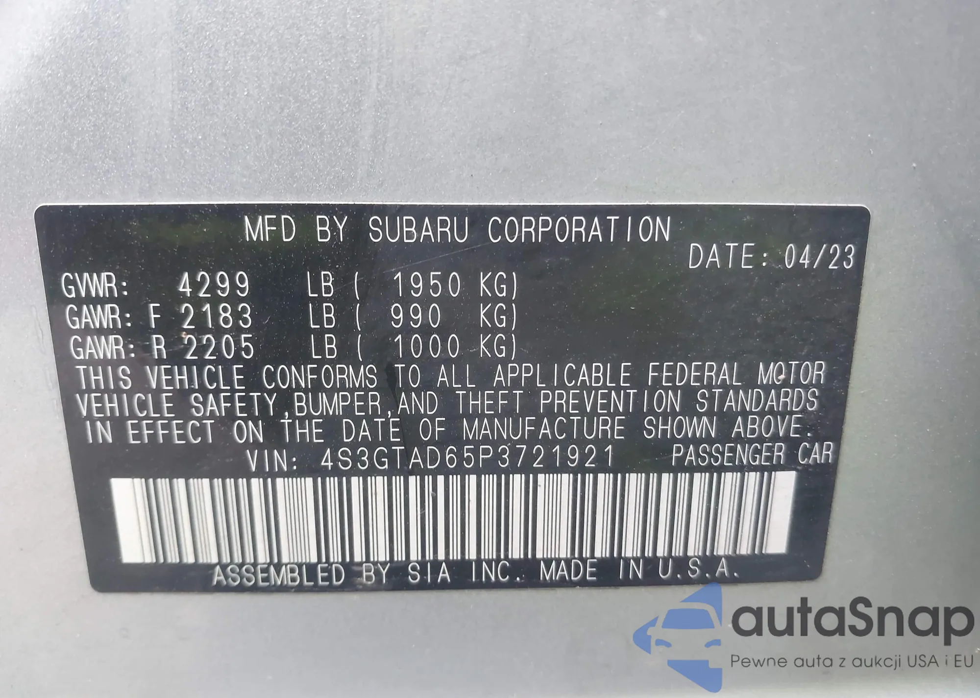• VIN 4S3GTAD65P3721921