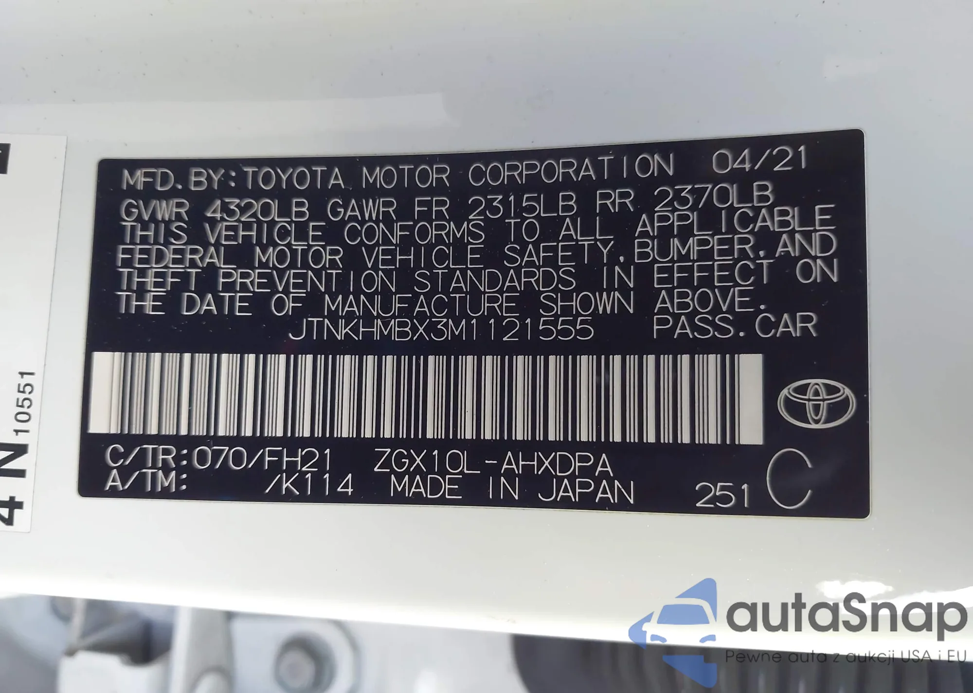 LOT: 43274016 VIN: JTNKHMBX3M1121555