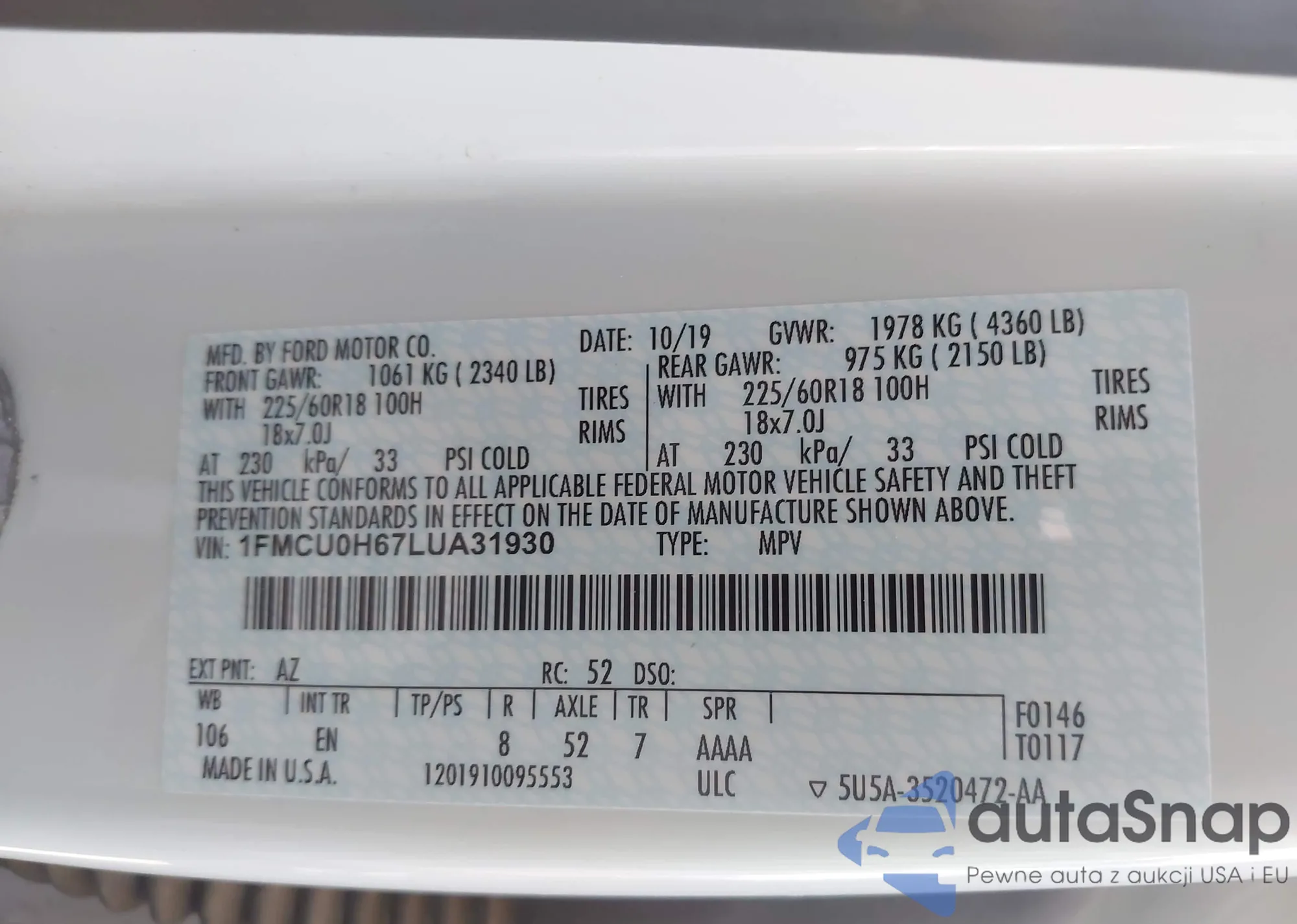 LOT: 43218805 VIN: 1FMCU0H67LUA31930