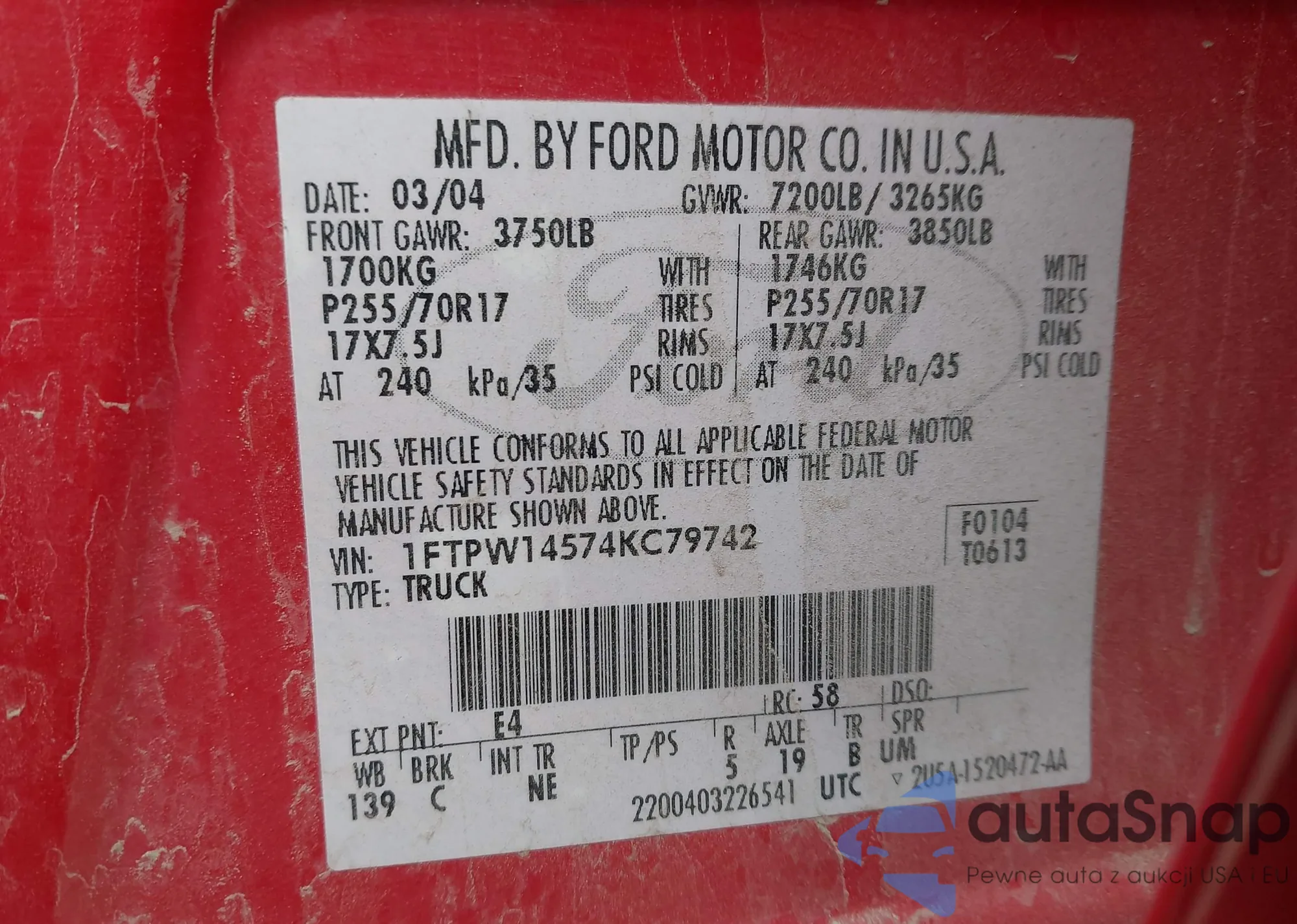 LOT: 41105059 VIN: 1FTPW14574KC79742