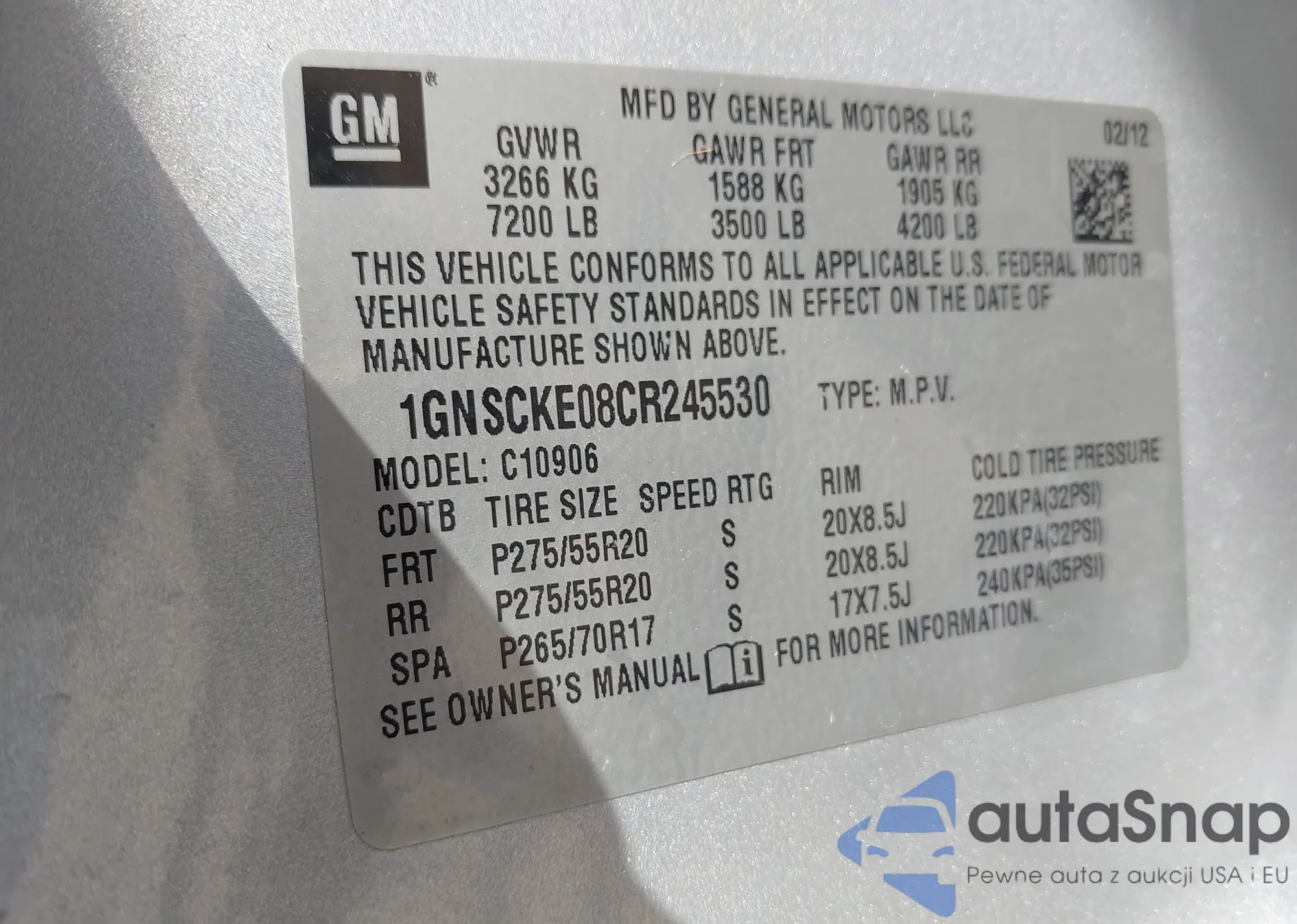 LOT: 43255532 VIN: 1GNSCKE08CR245530