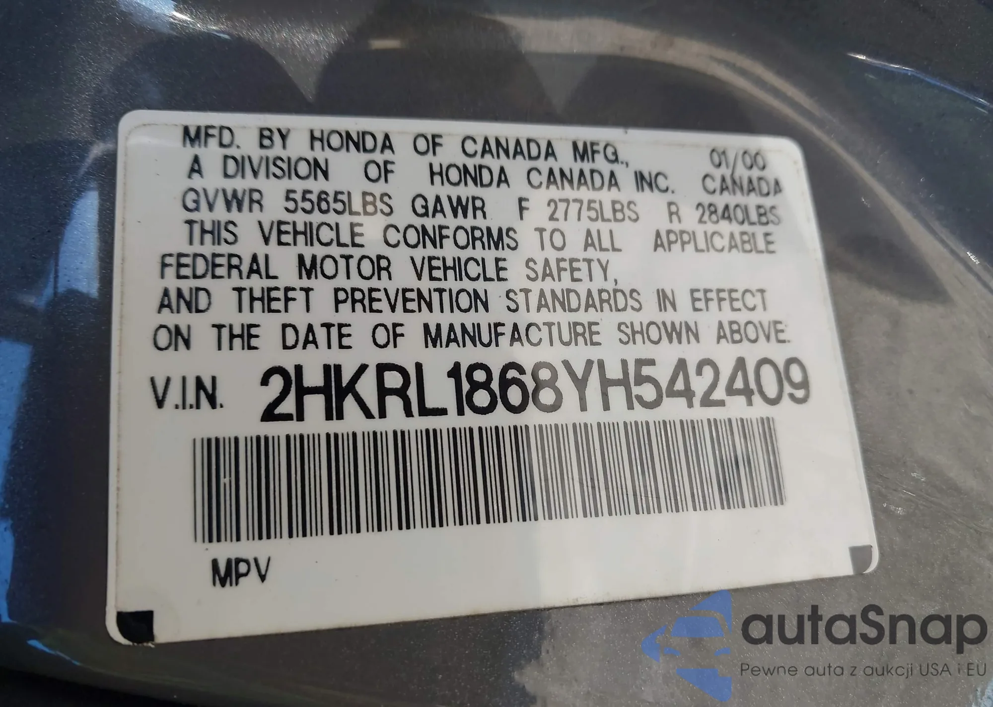 • VIN 2HKRL1868YH542409