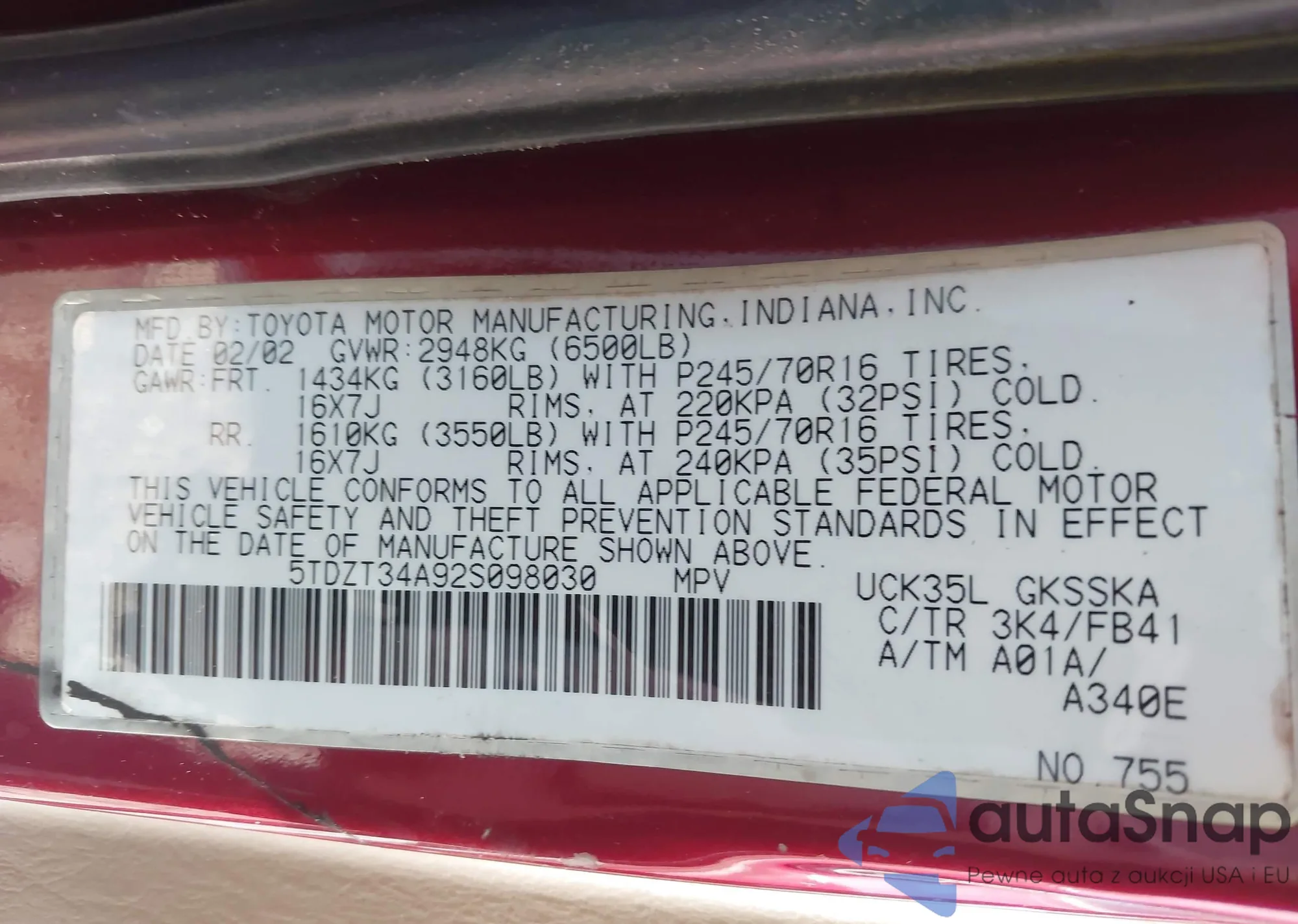 LOT: 43239089 VIN: 5TDZT34A92S098030