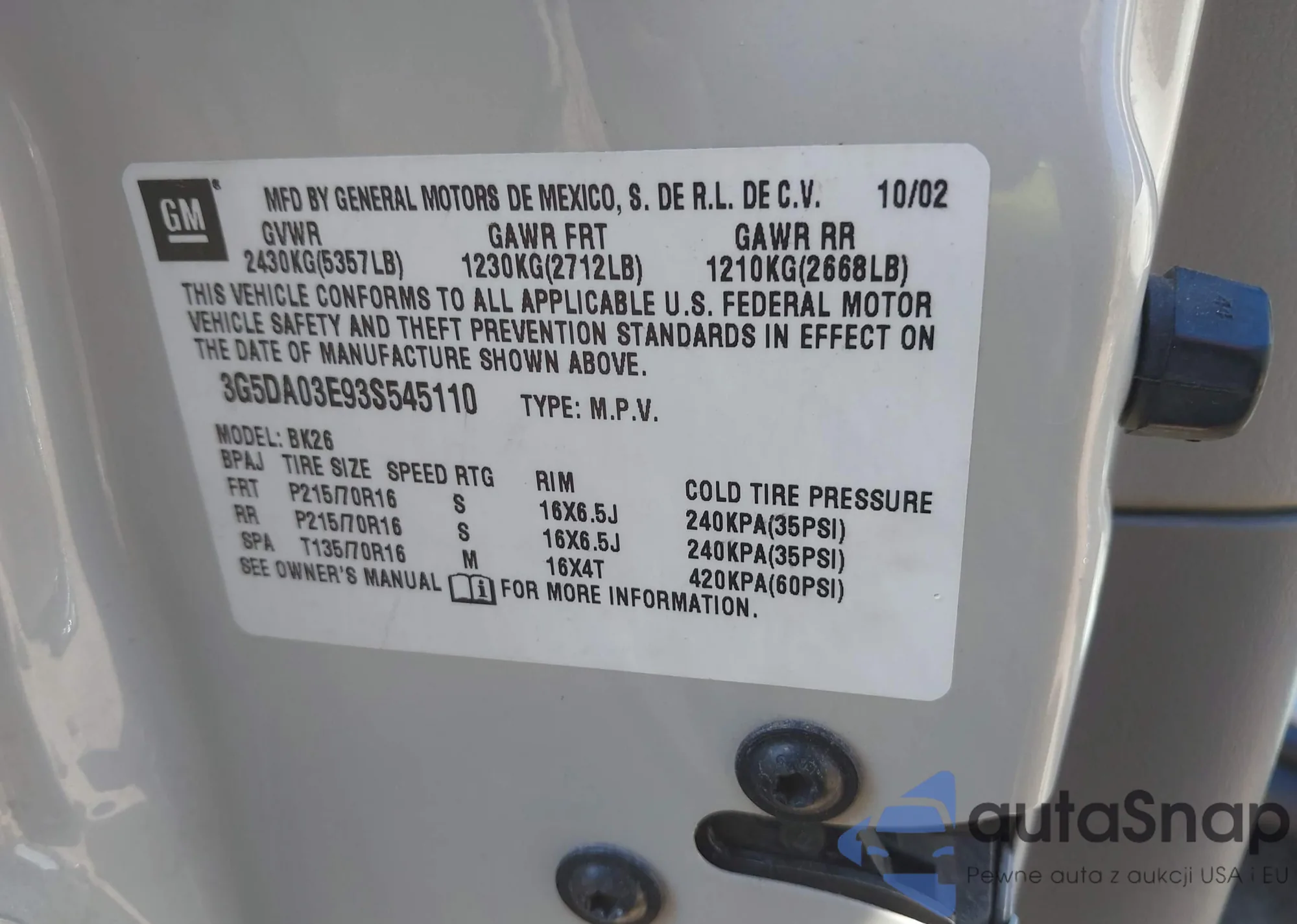 LOT: 43282855 VIN: 3G5DA03E93S545110