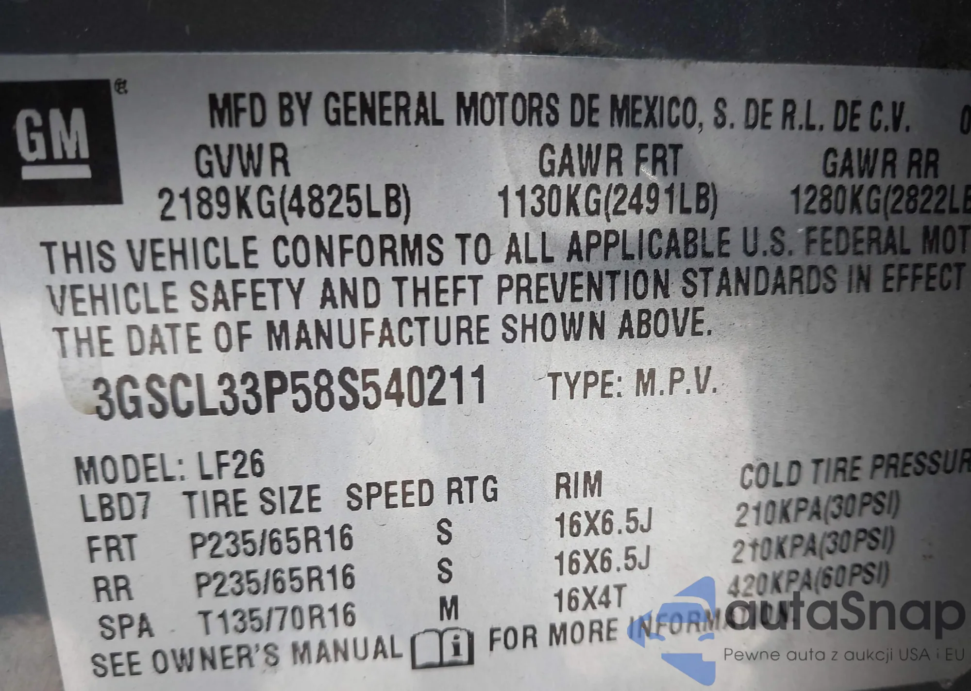 • VIN 3GSCL33P58S540211