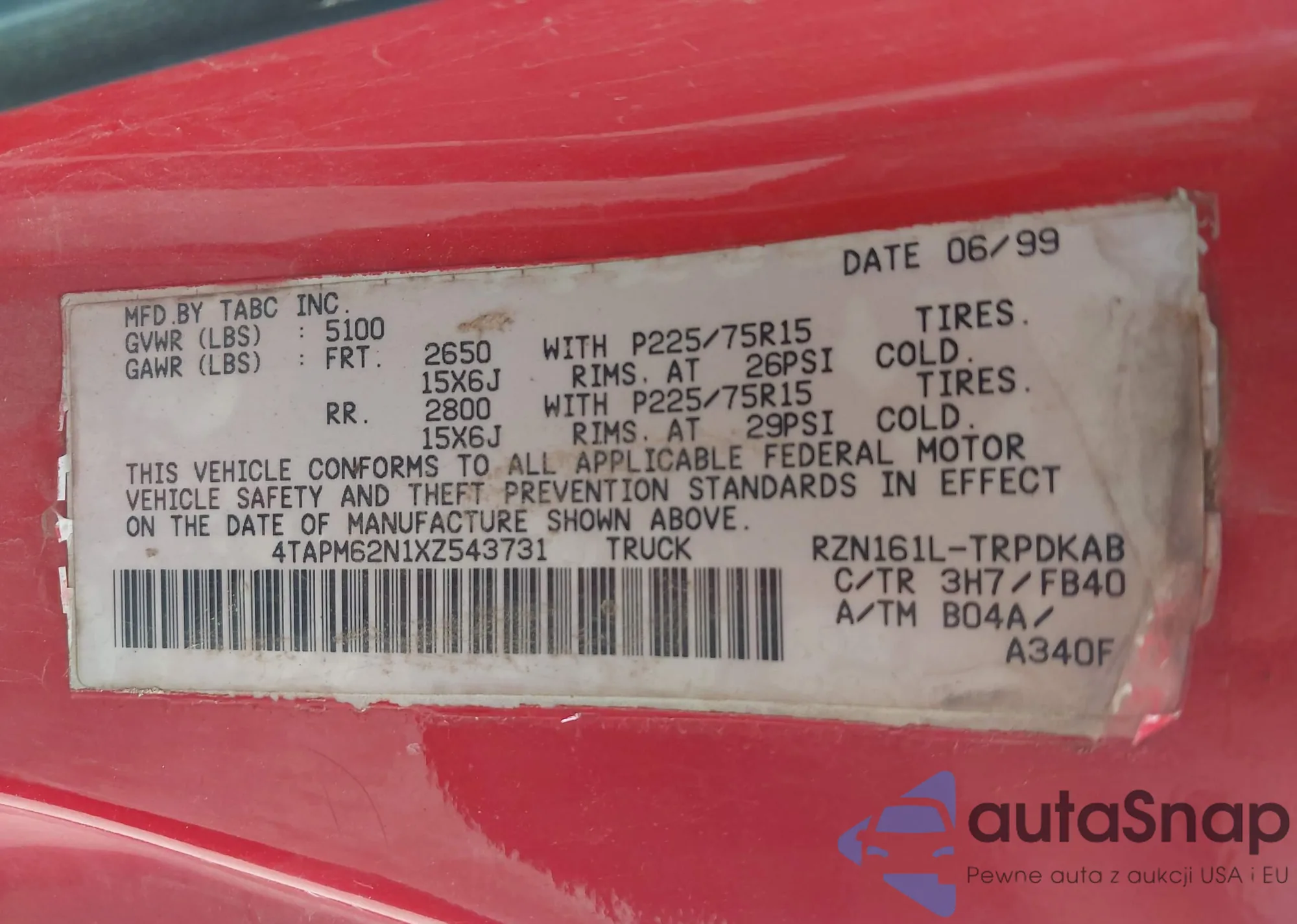 • VIN 4TAPM62N1XZ543731