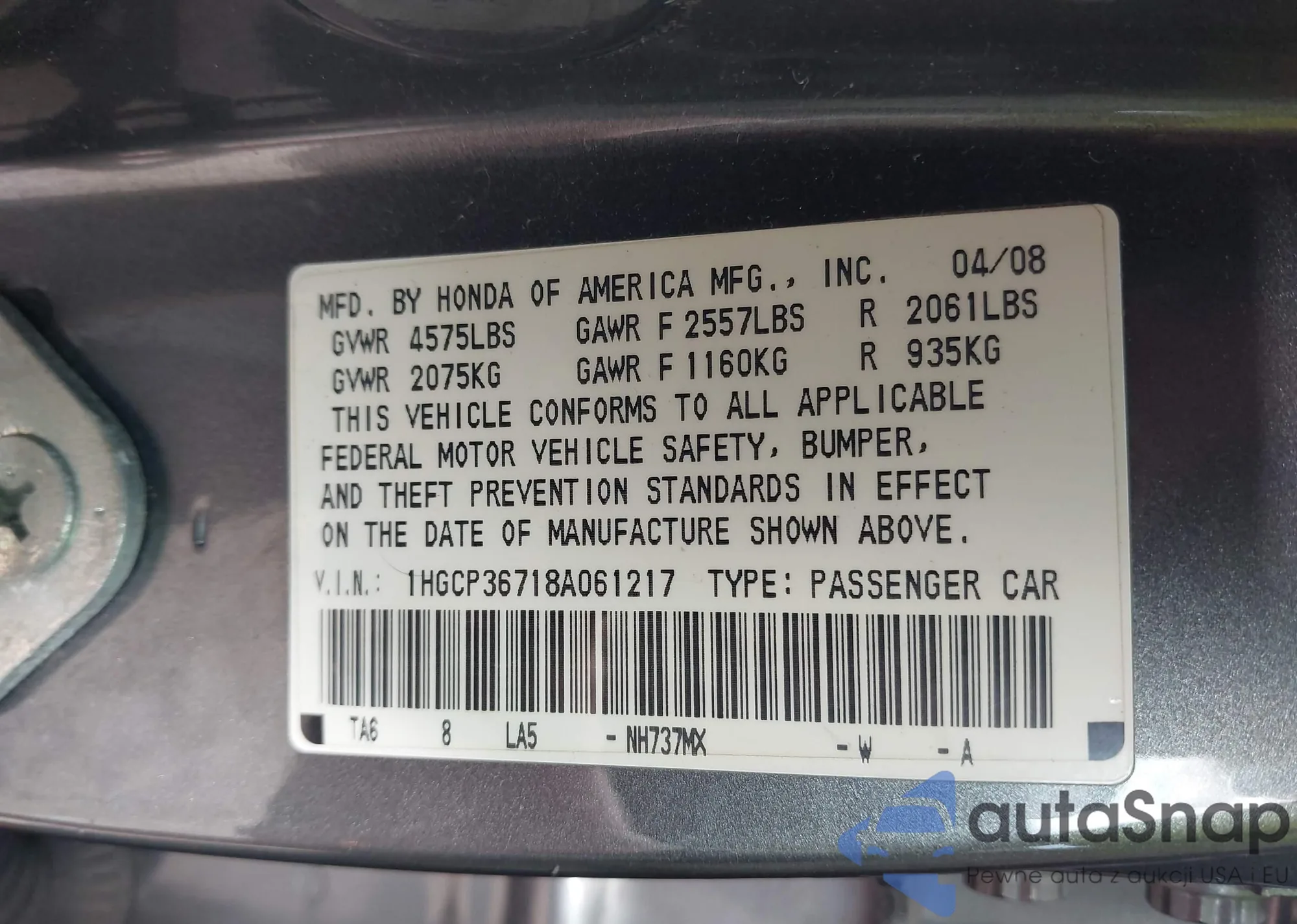 LOT: 43278101 VIN: 1HGCP36718A061217