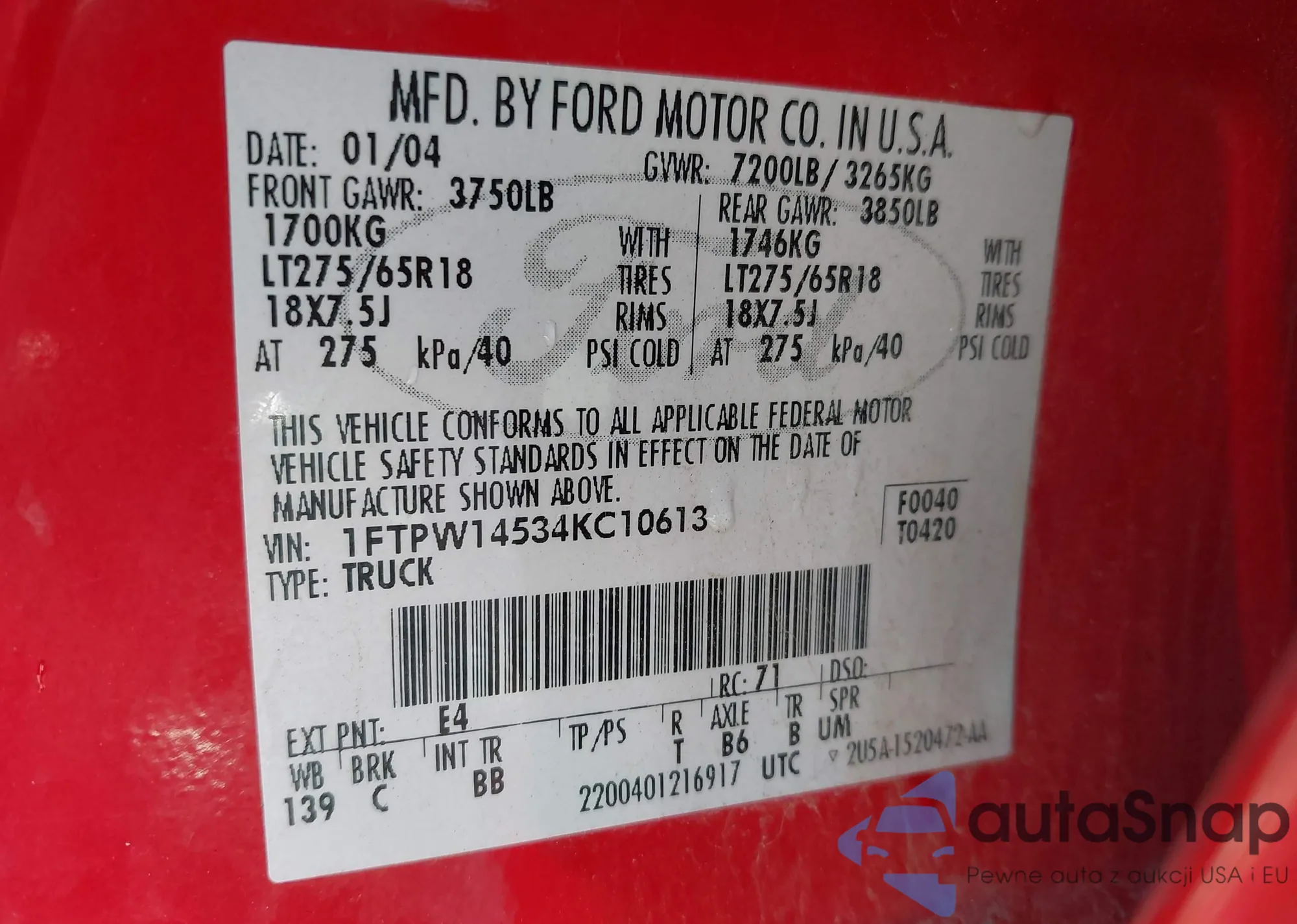 LOT: 43497199 VIN: 1FTPW14534KC10613