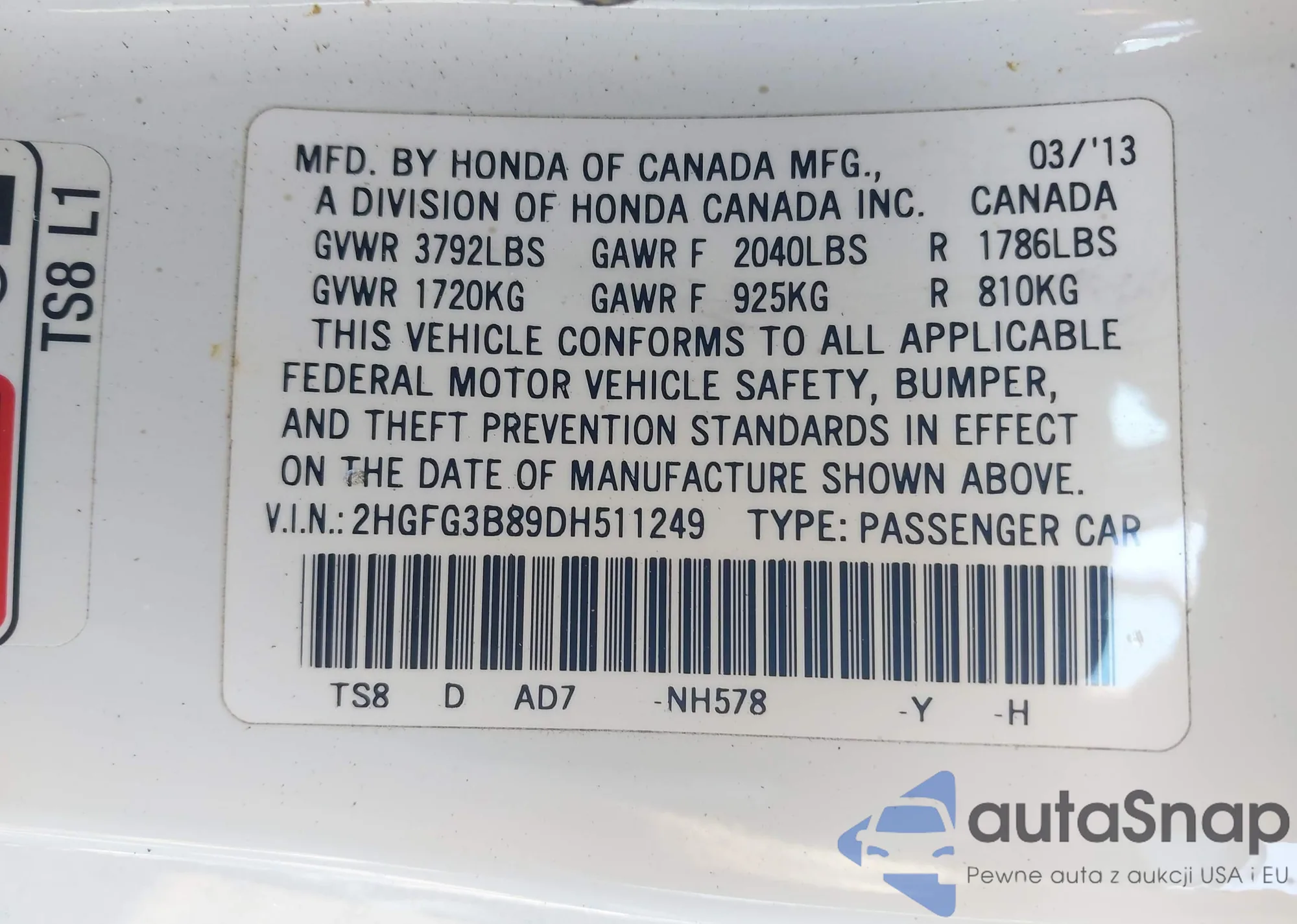 LOT: 42760694 VIN: 2HGFG3B89DH511249