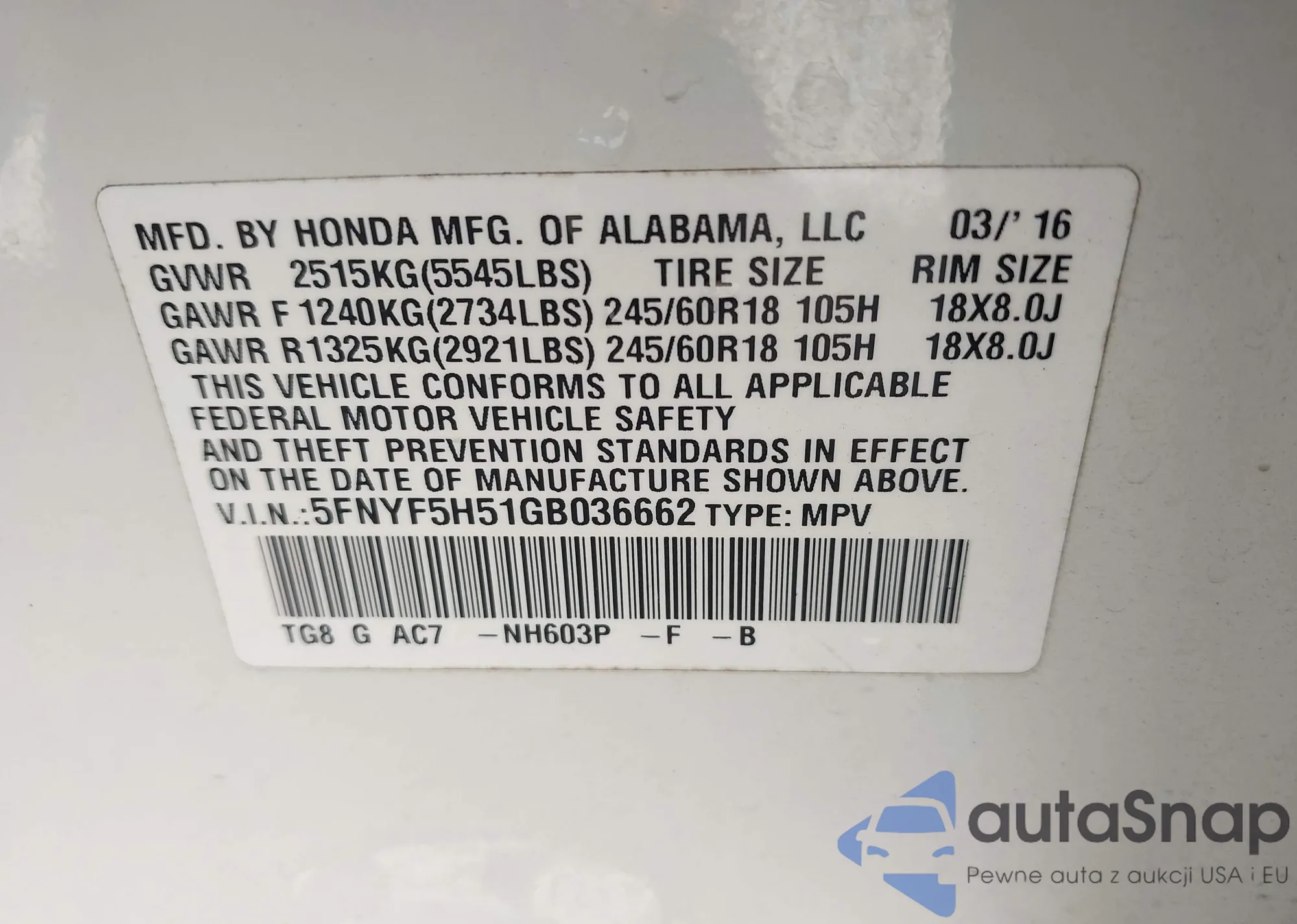 • VIN 5FNYF5H51GB036662