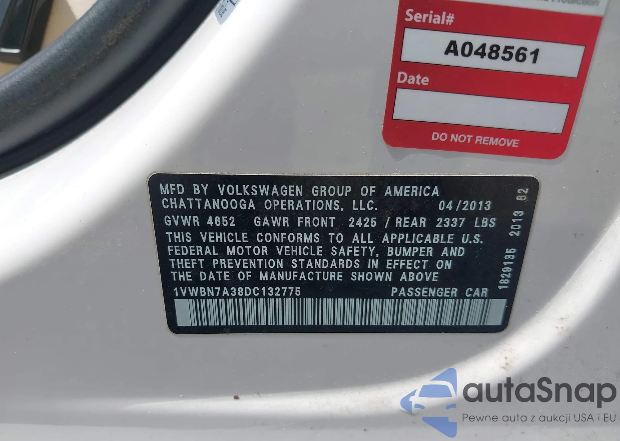 • VIN 1VWBN7A38DC132775