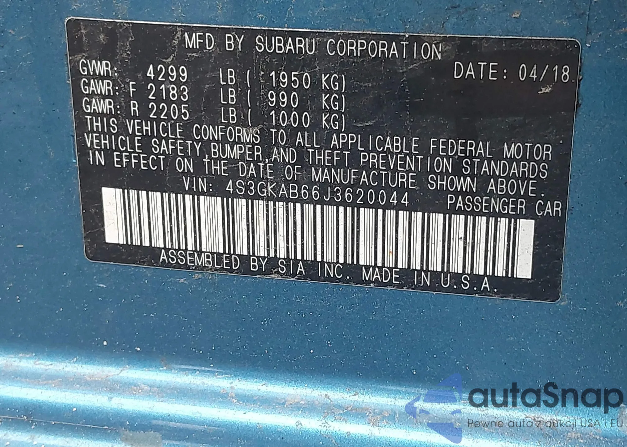 • VIN 4S3GKAB66J3620044