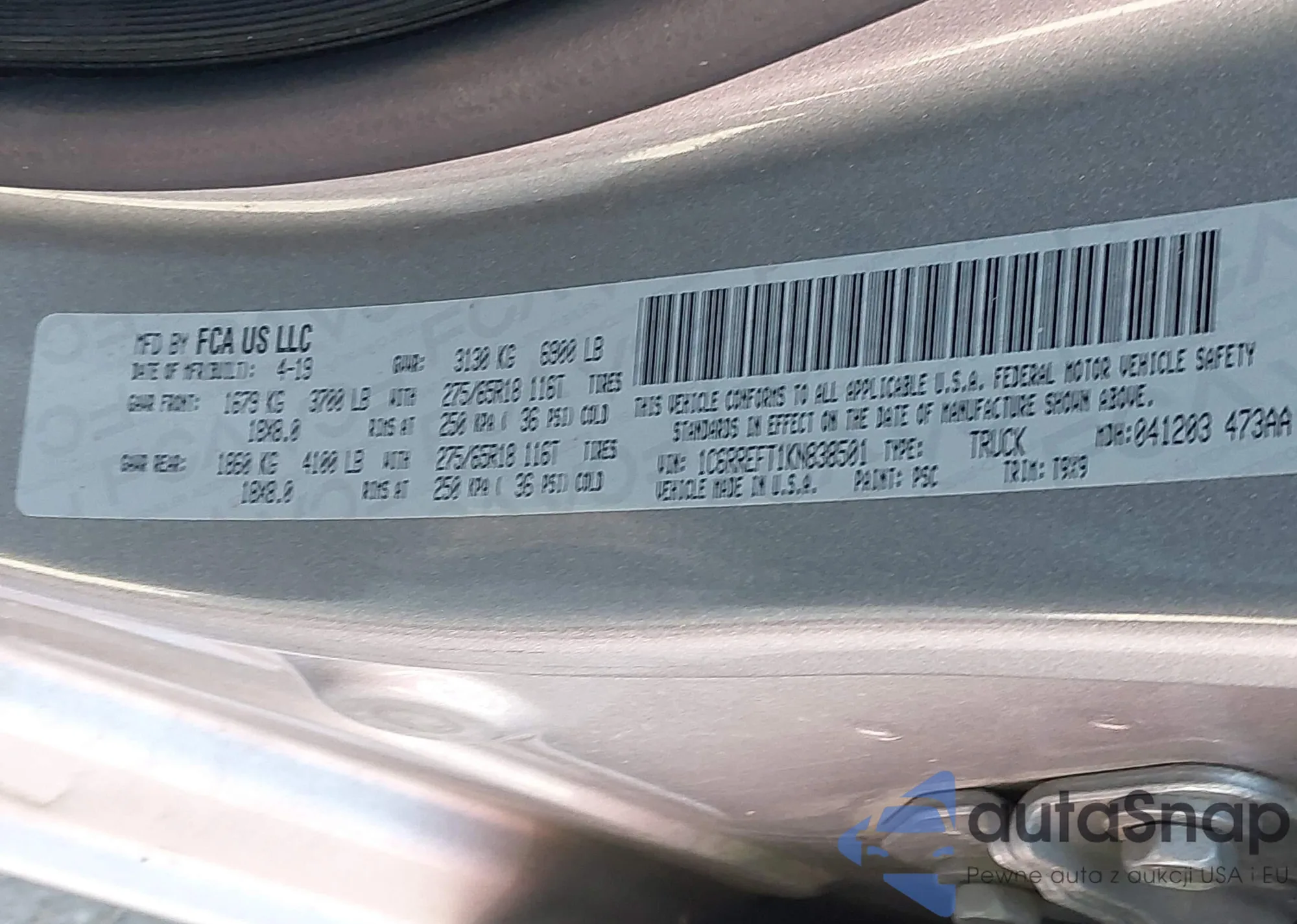 LOT: 43109731 VIN: 1C6RREFT1KN838501