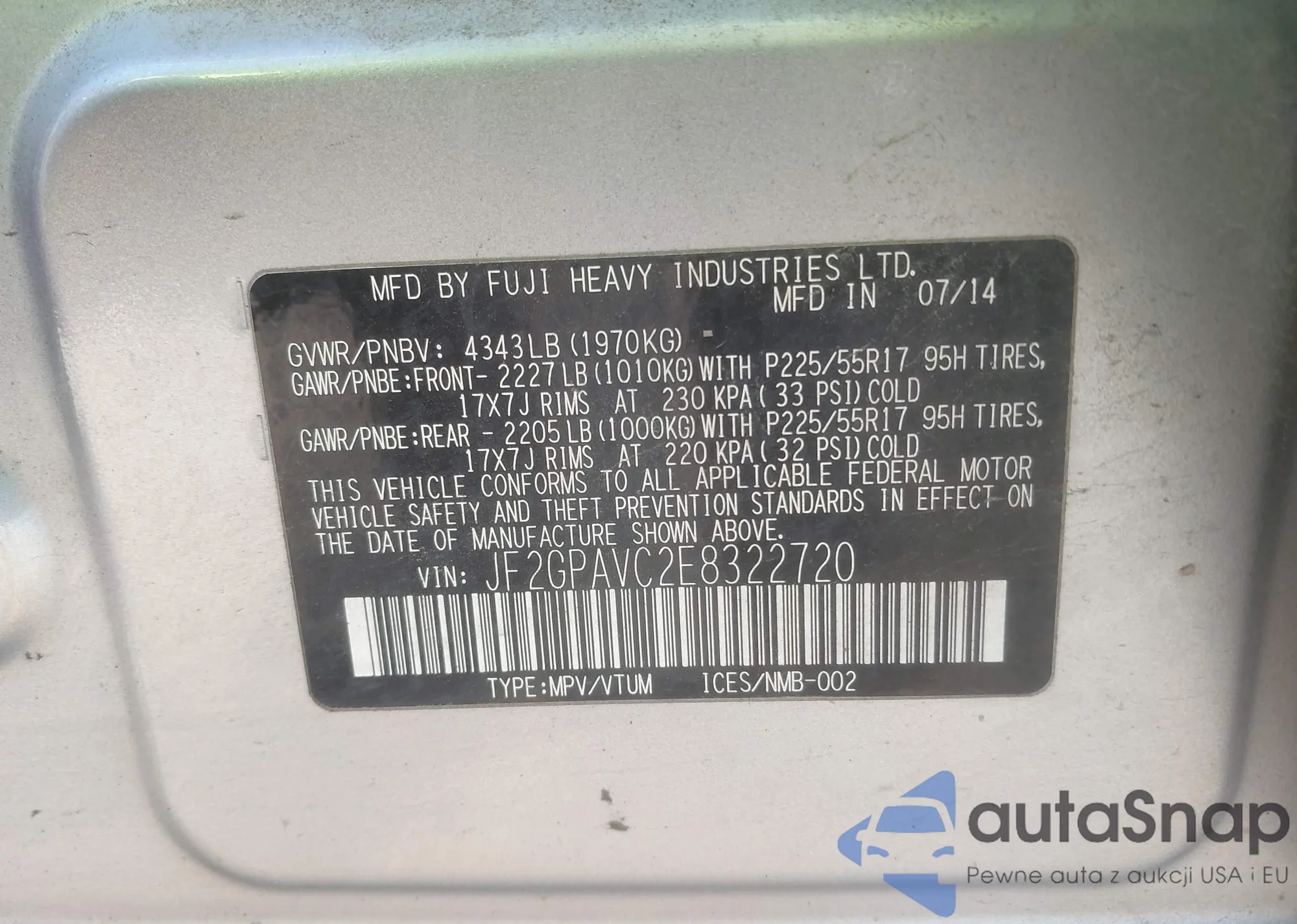 LOT: 43532251 VIN: JF2GPAVC2E8322720