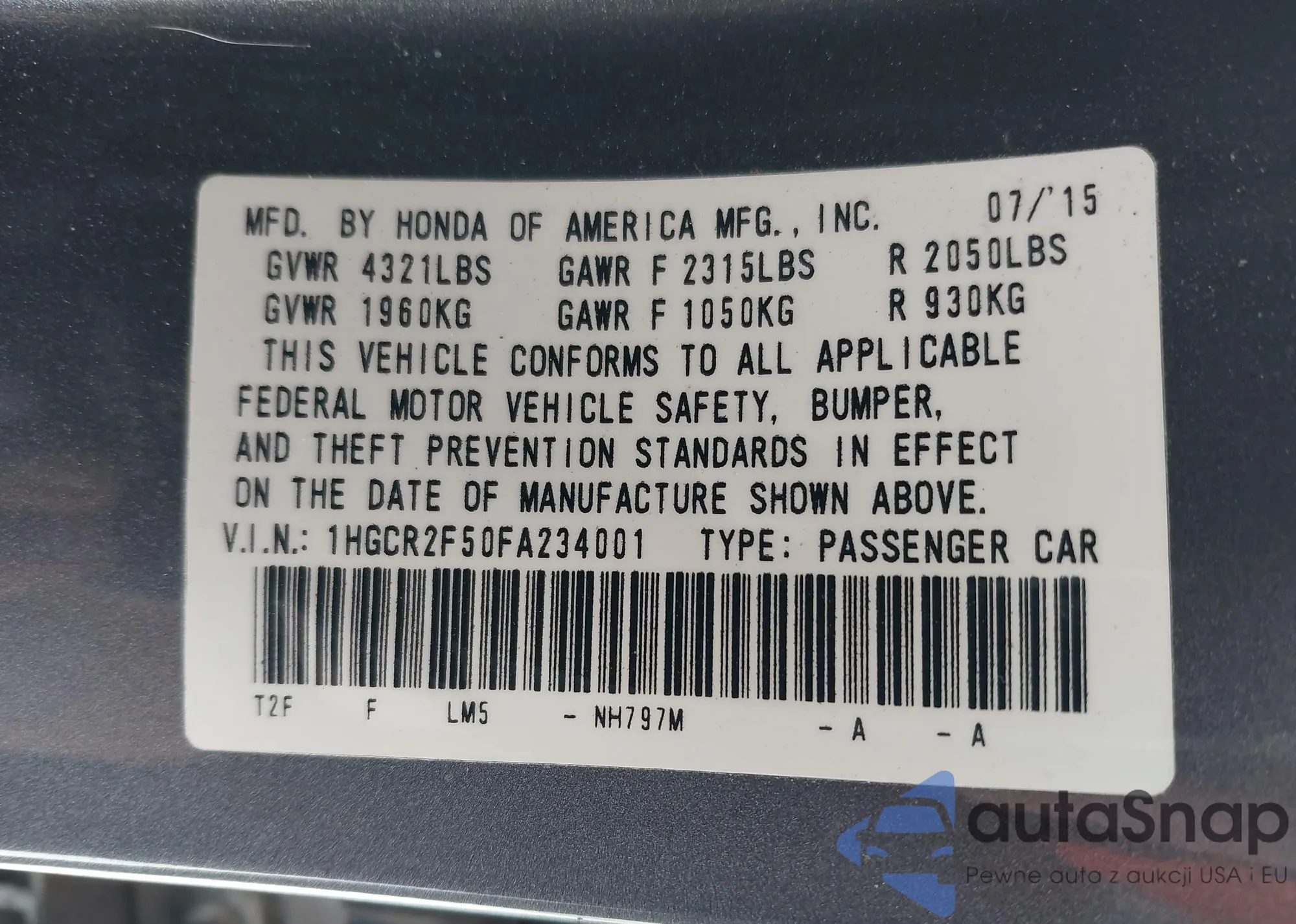LOT: 41541583 VIN: 1HGCR2F50FA234001