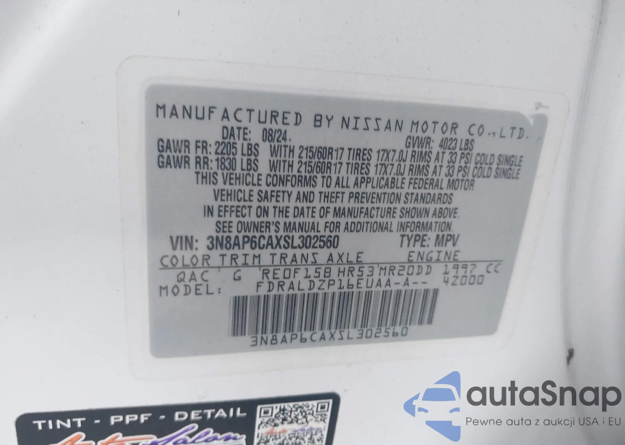 LOT: 43317703 VIN: 3N8AP6CAXSL302560