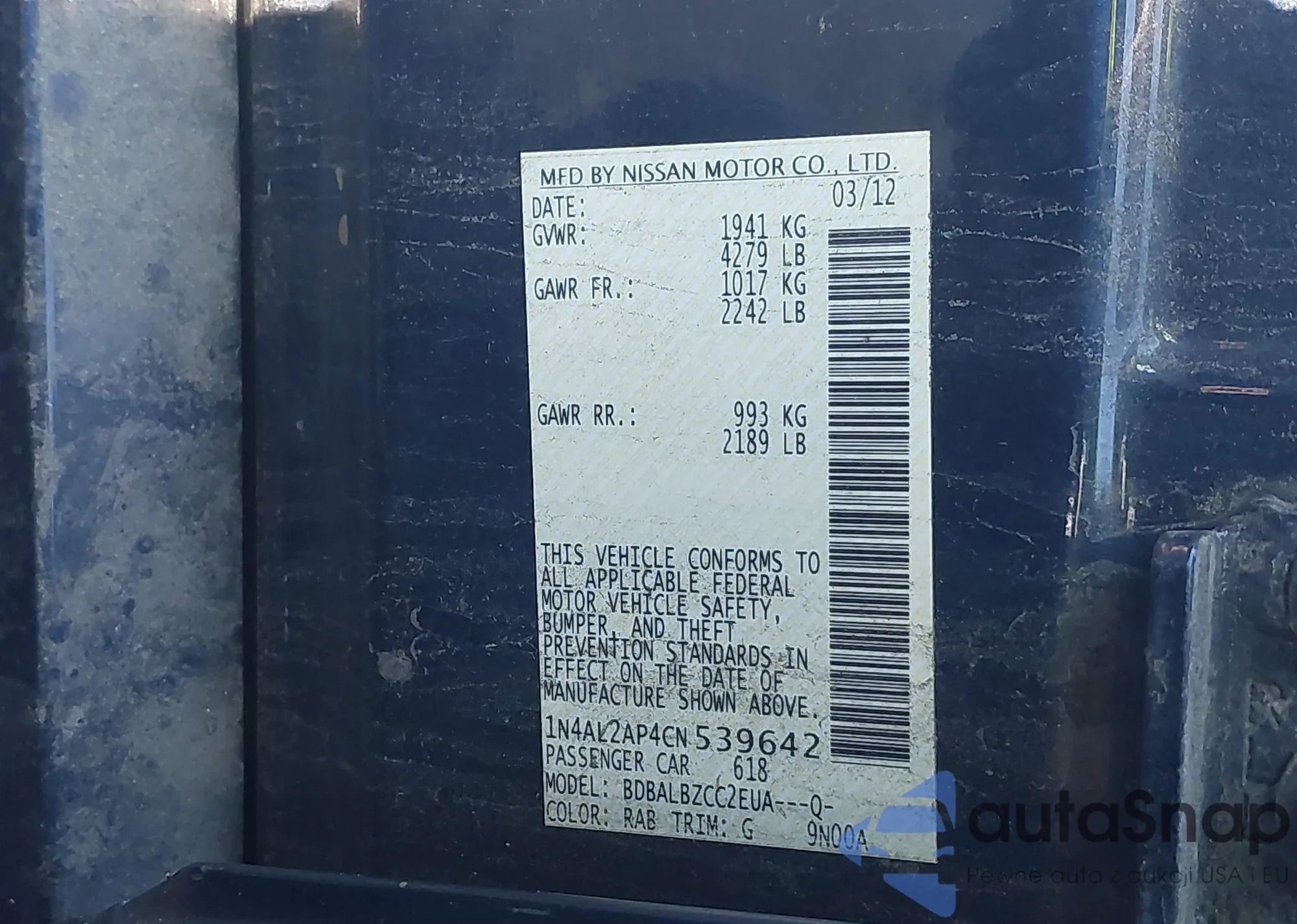 LOT: 43351446 VIN: 1N4AL2AP4CN539642