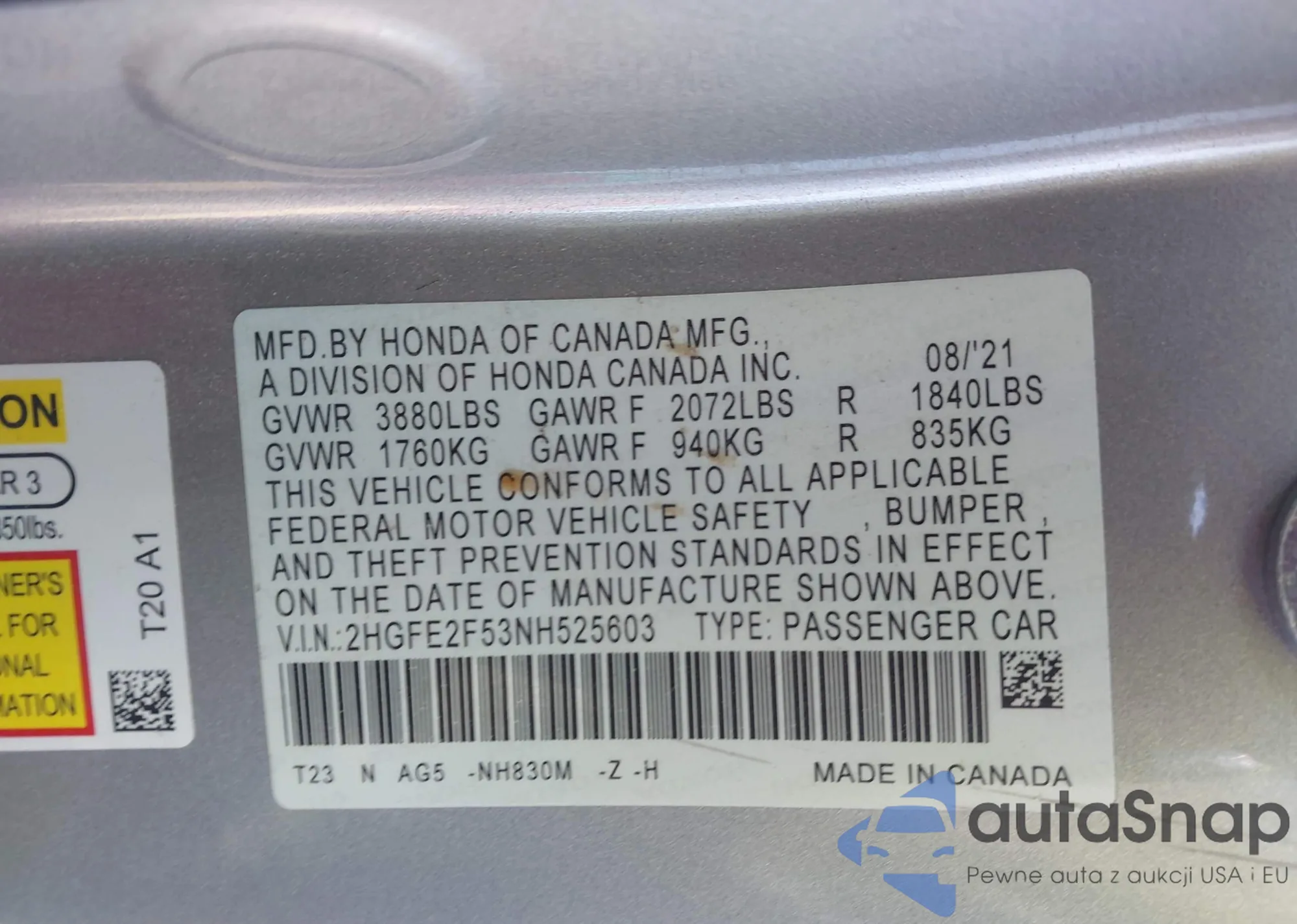 LOT: 43486615 VIN: 2HGFE2F53NH525603