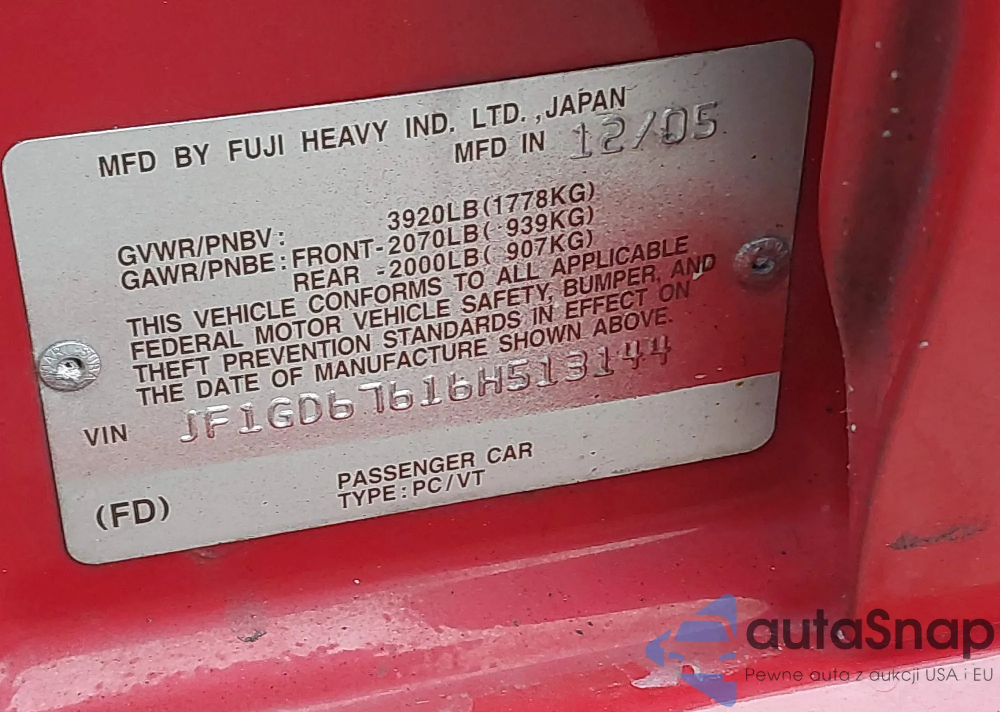LOT: 43552914 VIN: JF1GD67616H513144