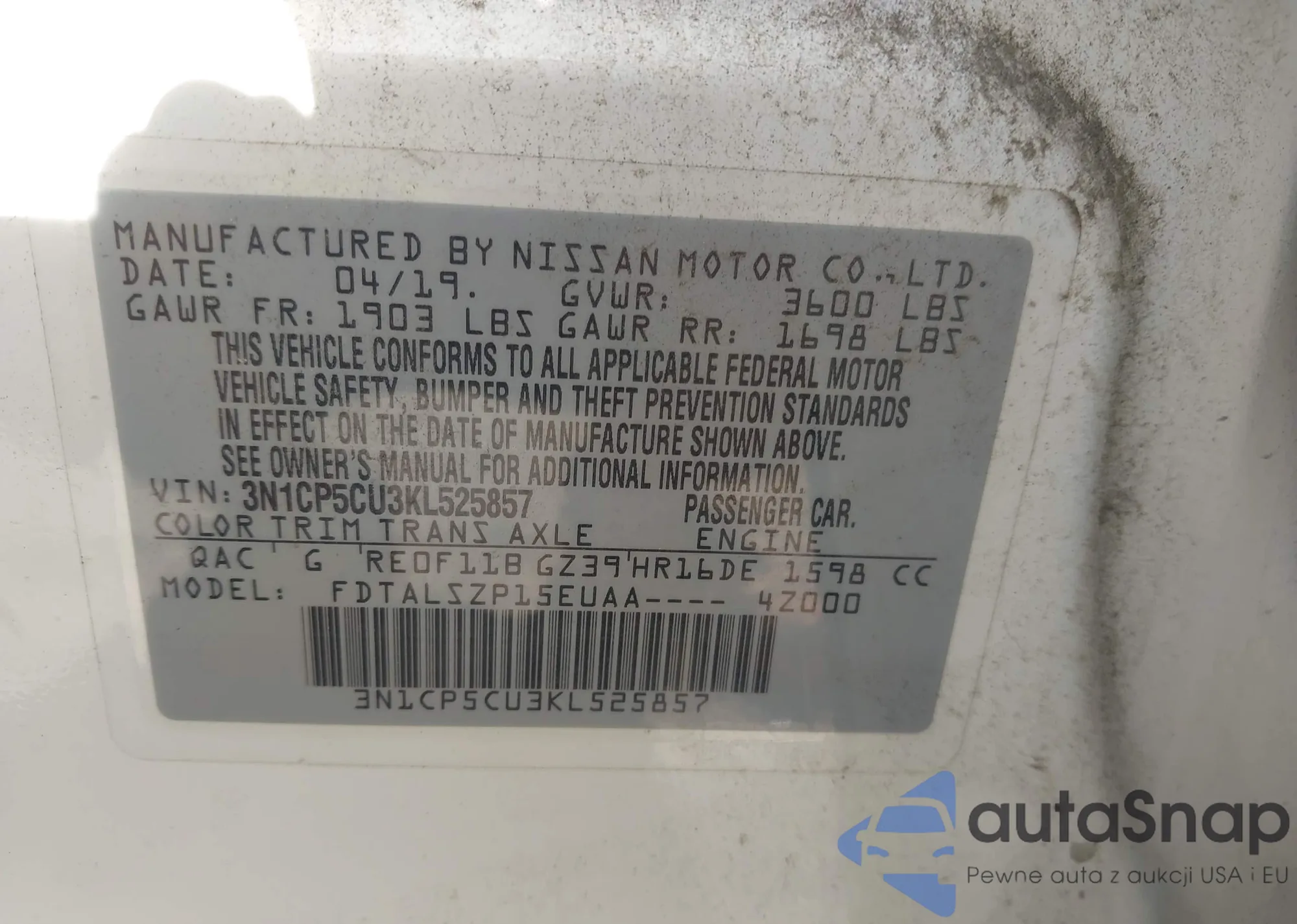 LOT: 43394925 VIN: 3N1CP5CU3KL525857