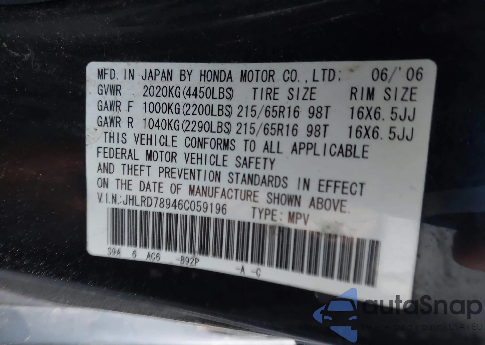 LOT: 43395512 VIN: JHLRE38747C065103