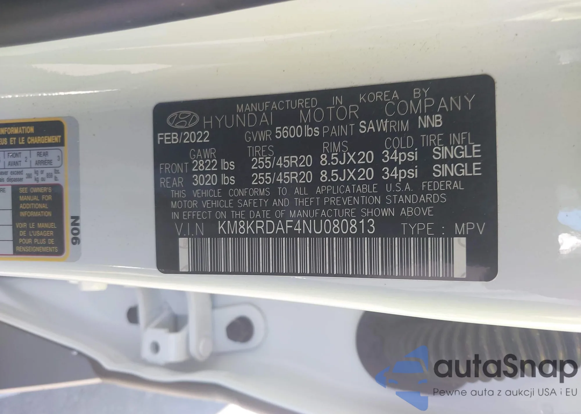 LOT: 43596398 VIN: KM8KRDAF4NU080813