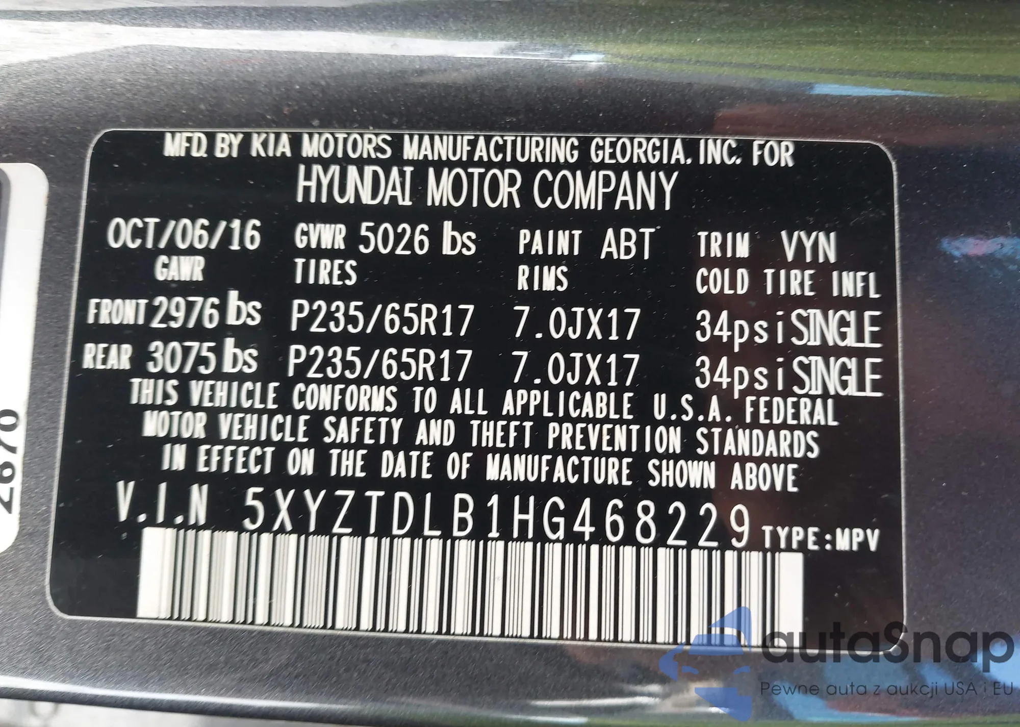 LOT: 43426246 VIN: 5XYZTDLB1HG468229