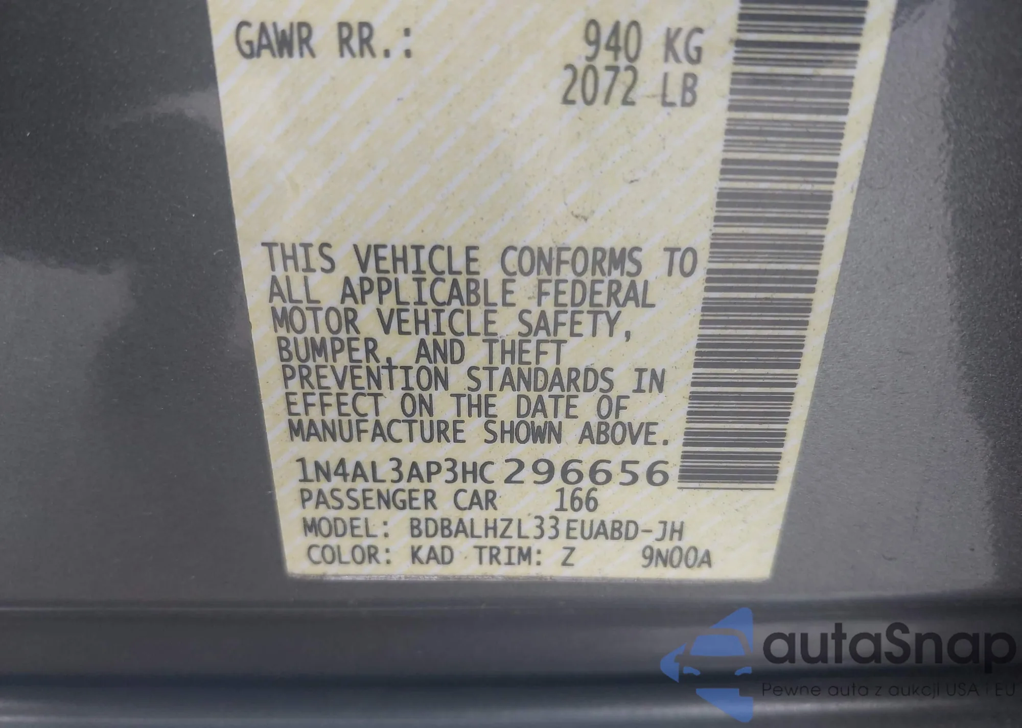 LOT: 42768981 VIN: 1N4AL3AP3HC296656