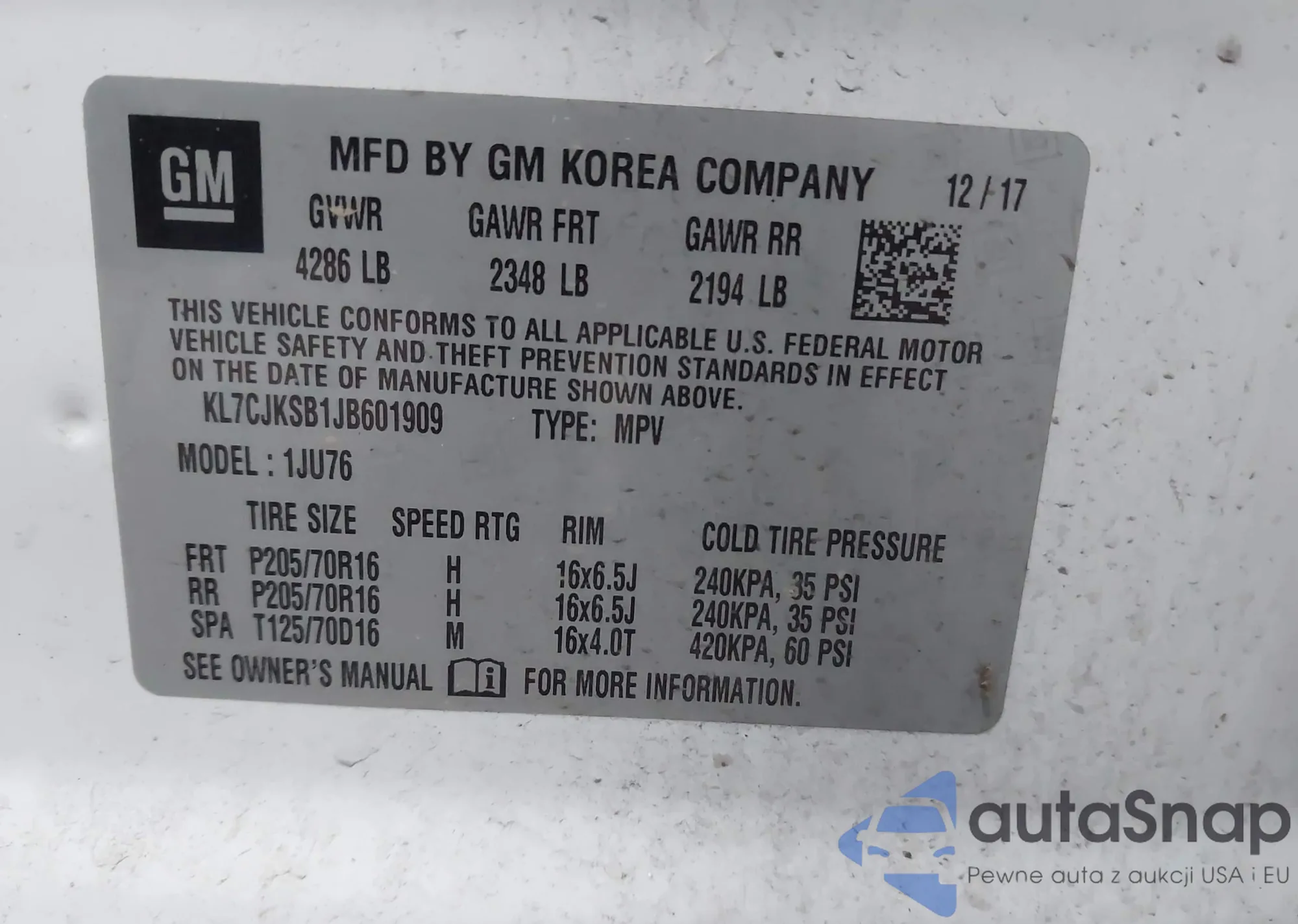 • VIN KL7CJKSB1JB601909