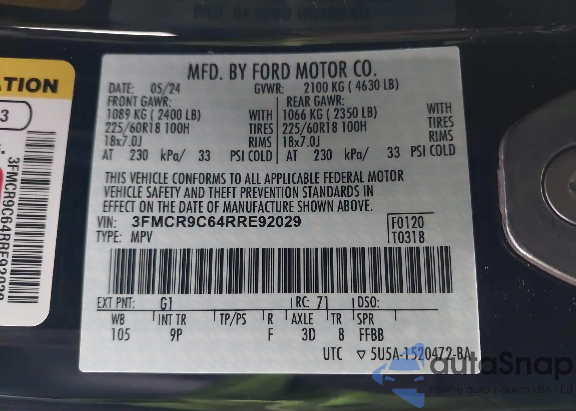 LOT: 43372491 VIN: 1FADP5BUXDL546731