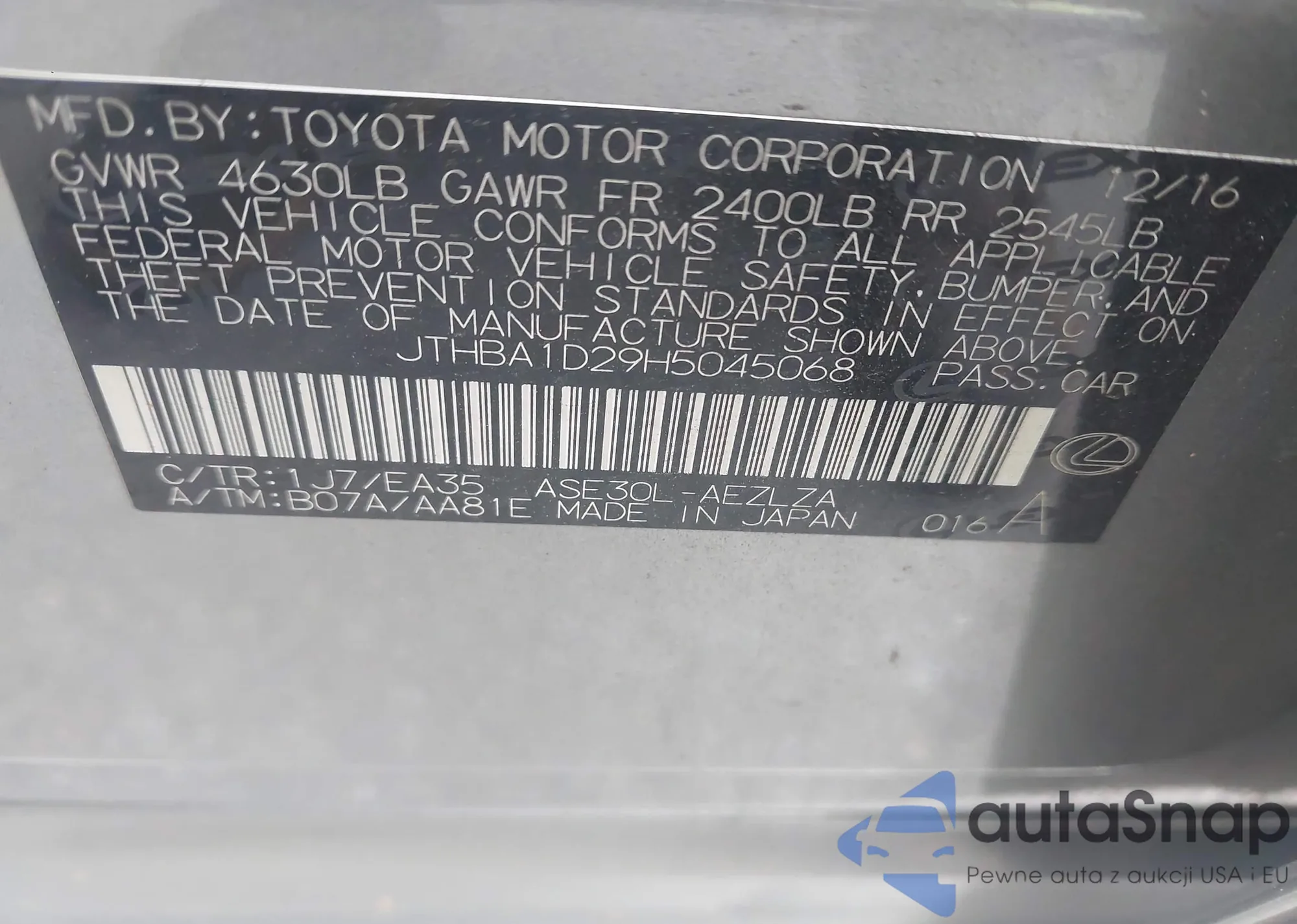 LOT: 43375625 VIN: JTHBA1D29H5045068