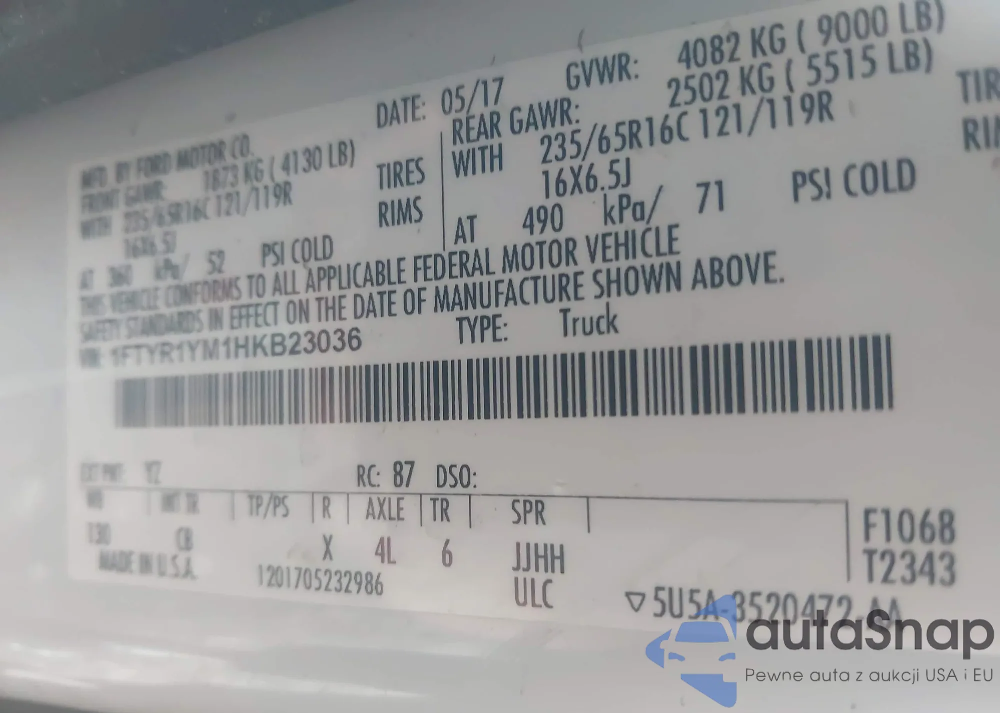 • VIN 1FTYR1YM1HKB23036