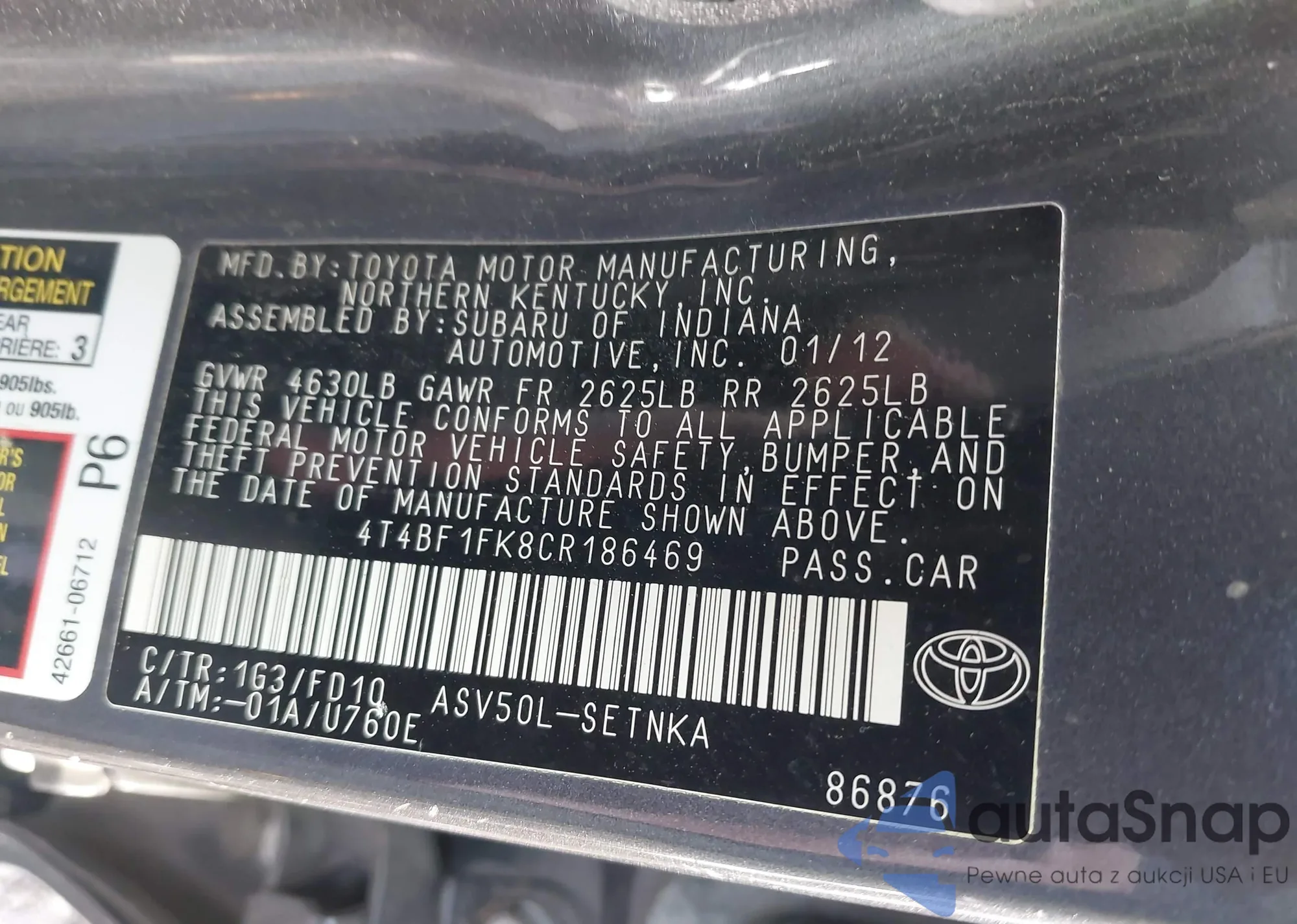 LOT: 43569814 VIN: 4T4BF1FK8CR186469