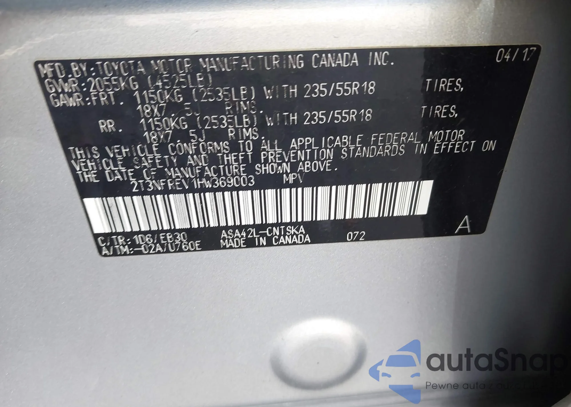 • VIN 2T3NFREV1HW369003