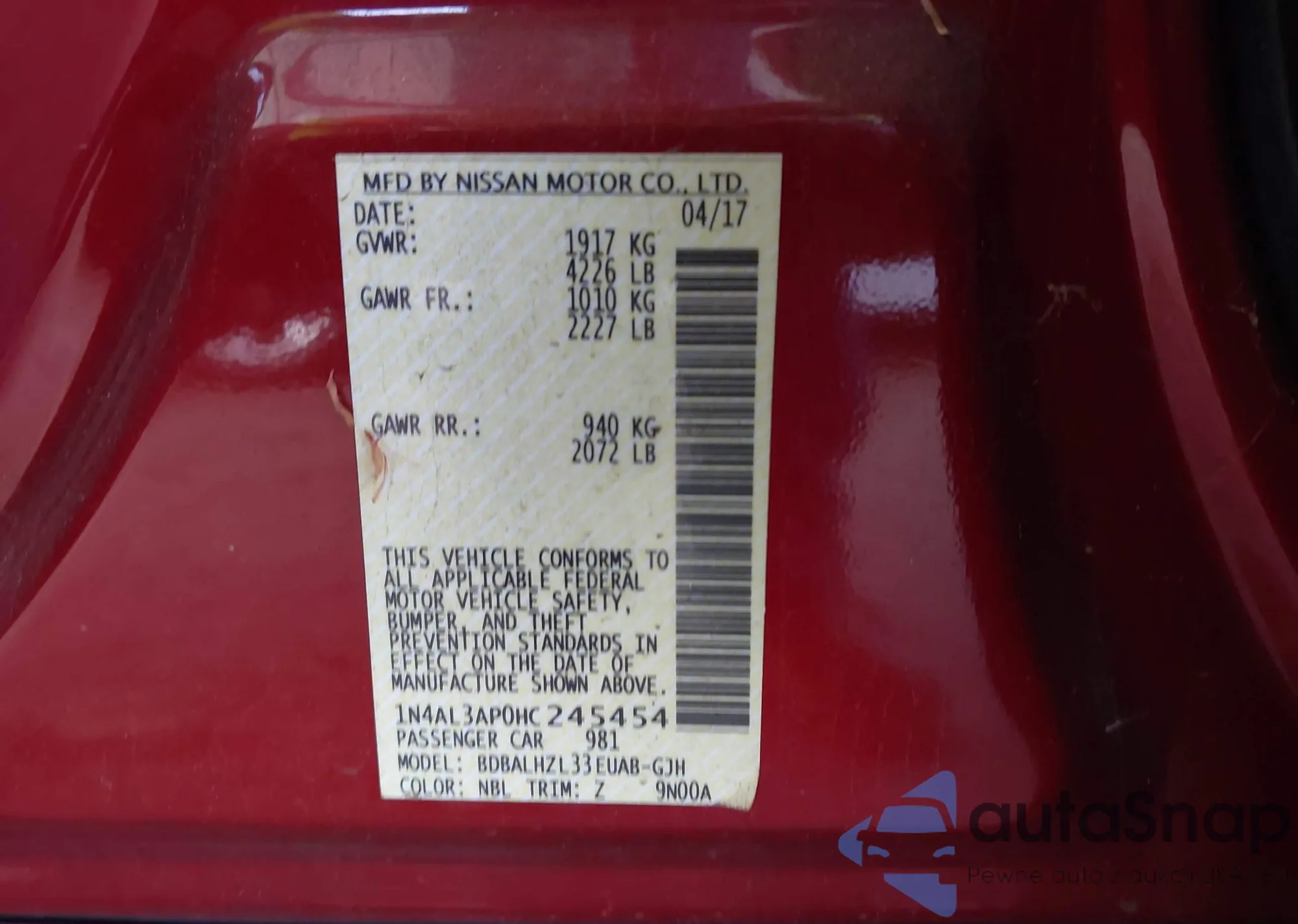 LOT: 43373944 VIN: 1N4AL3AP0HC245454