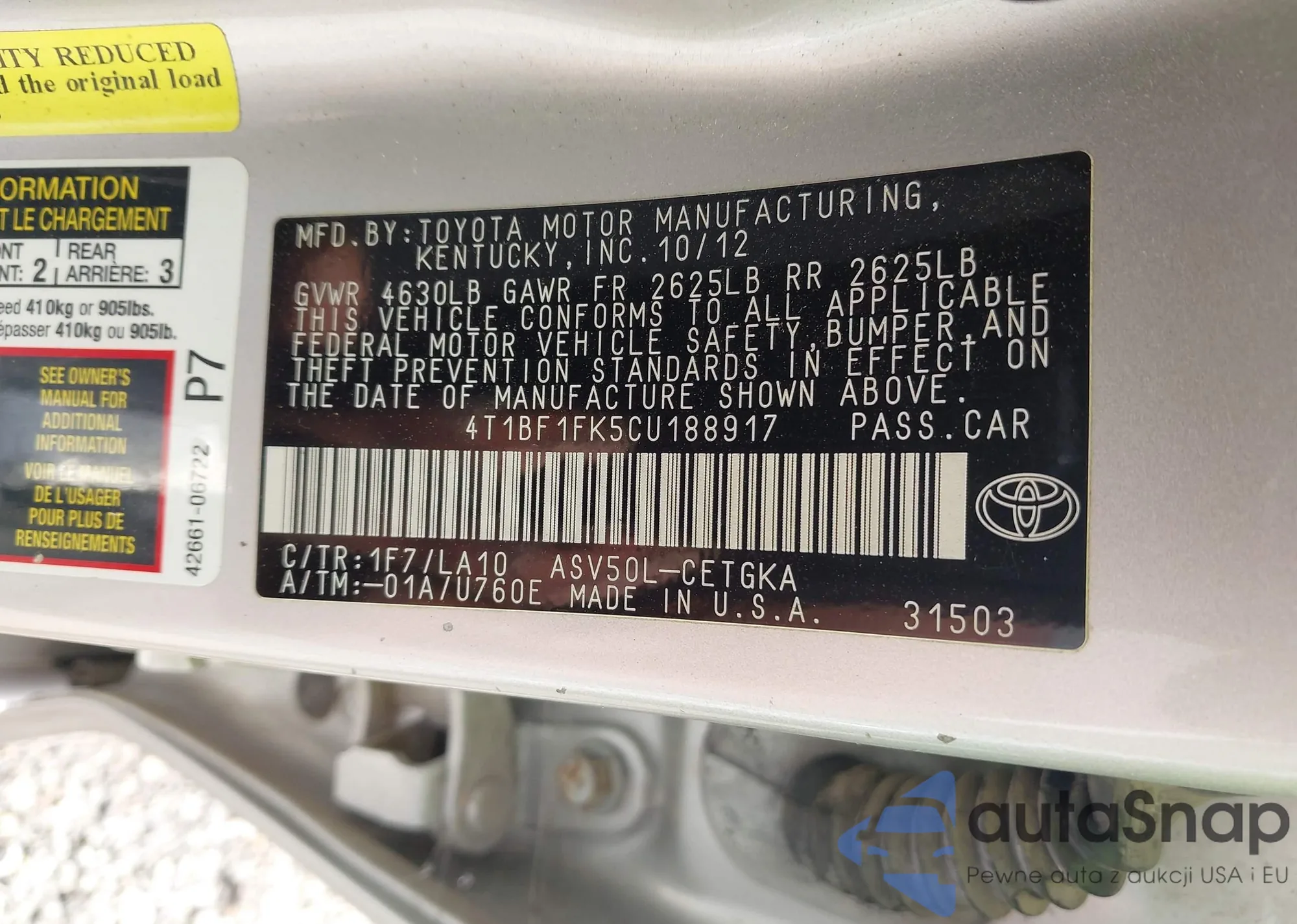 LOT: 43534799 VIN: 4T1BF1FK5CU188917