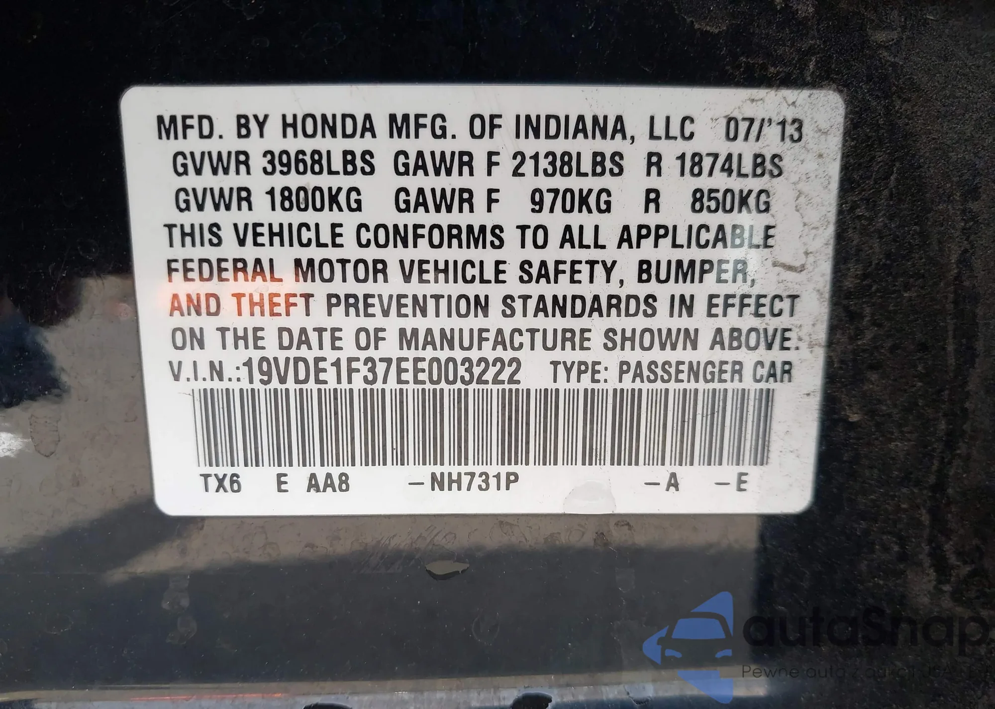 LOT: 43441016 VIN: 19VDE1F37EE003222