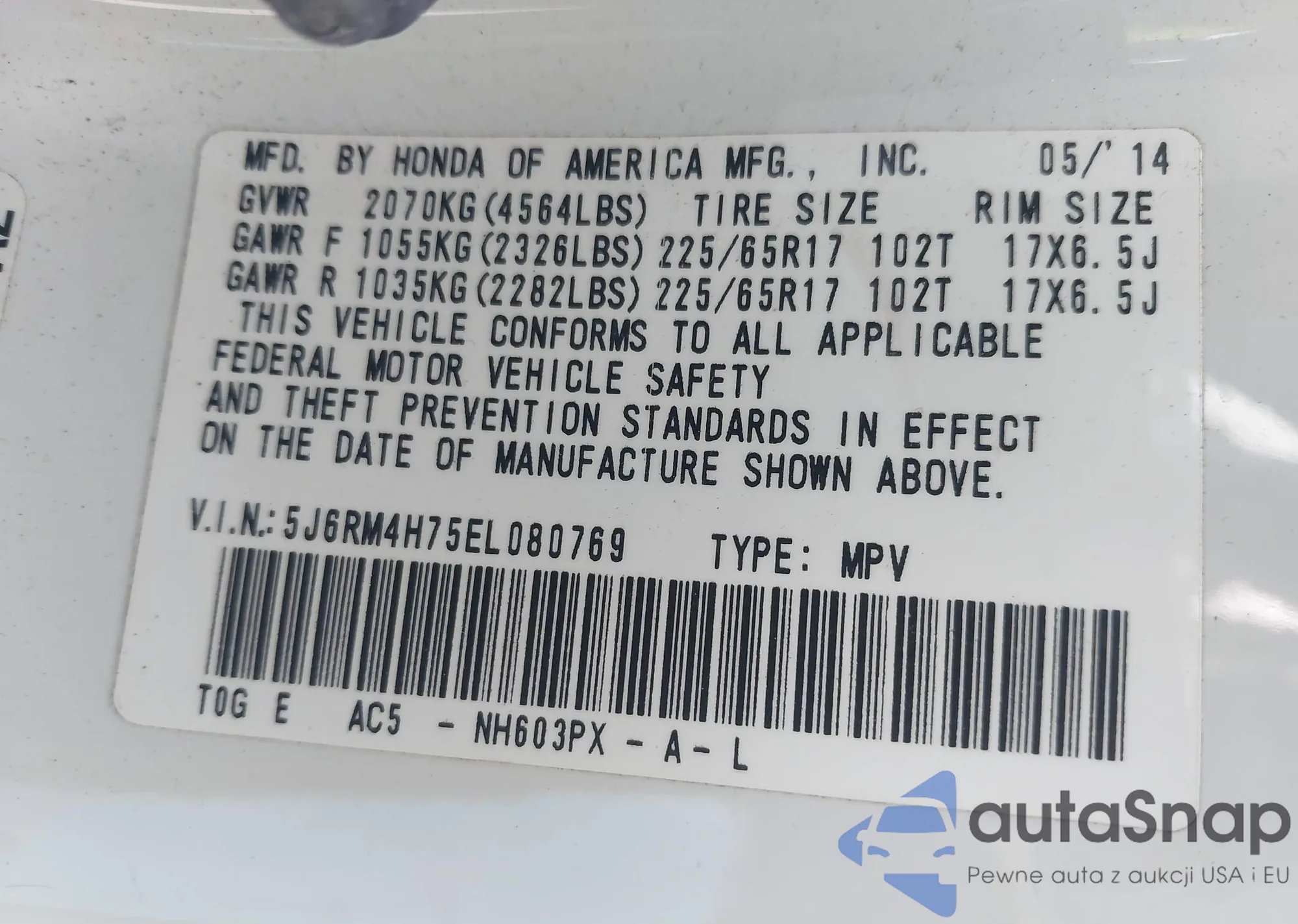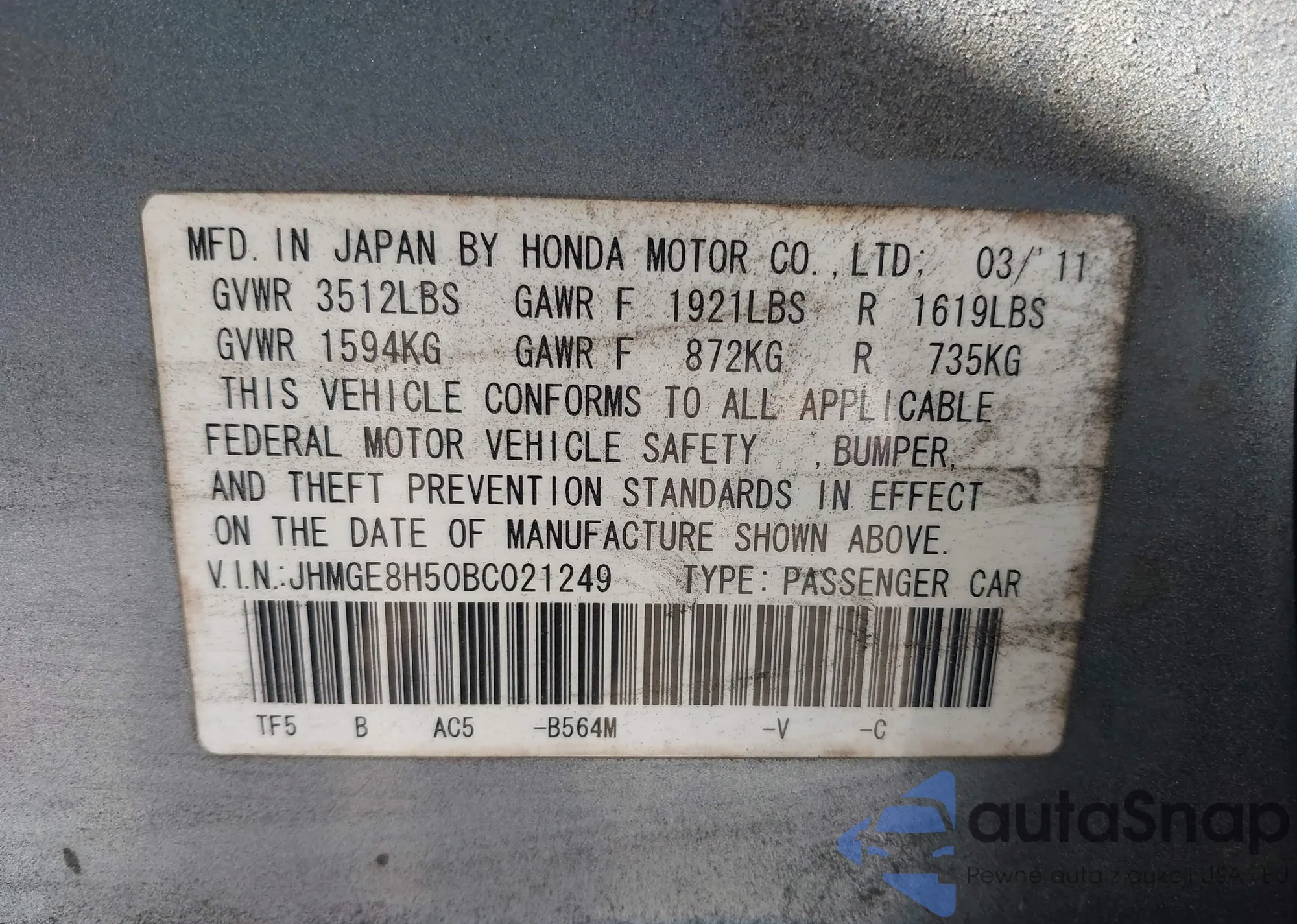 • VIN JHMGE8H50BC021249