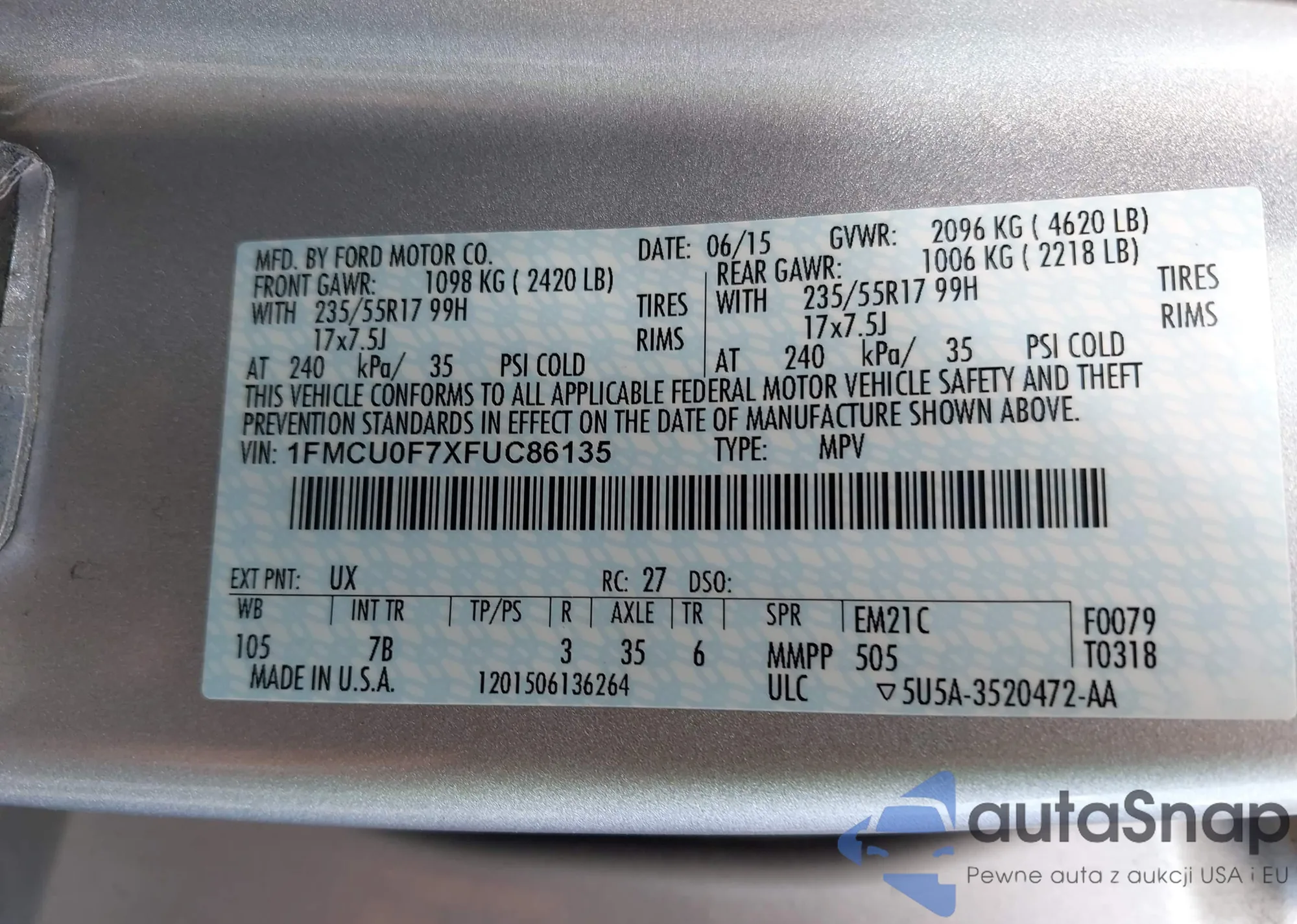 • VIN 1FMCU0F7XFUC86135