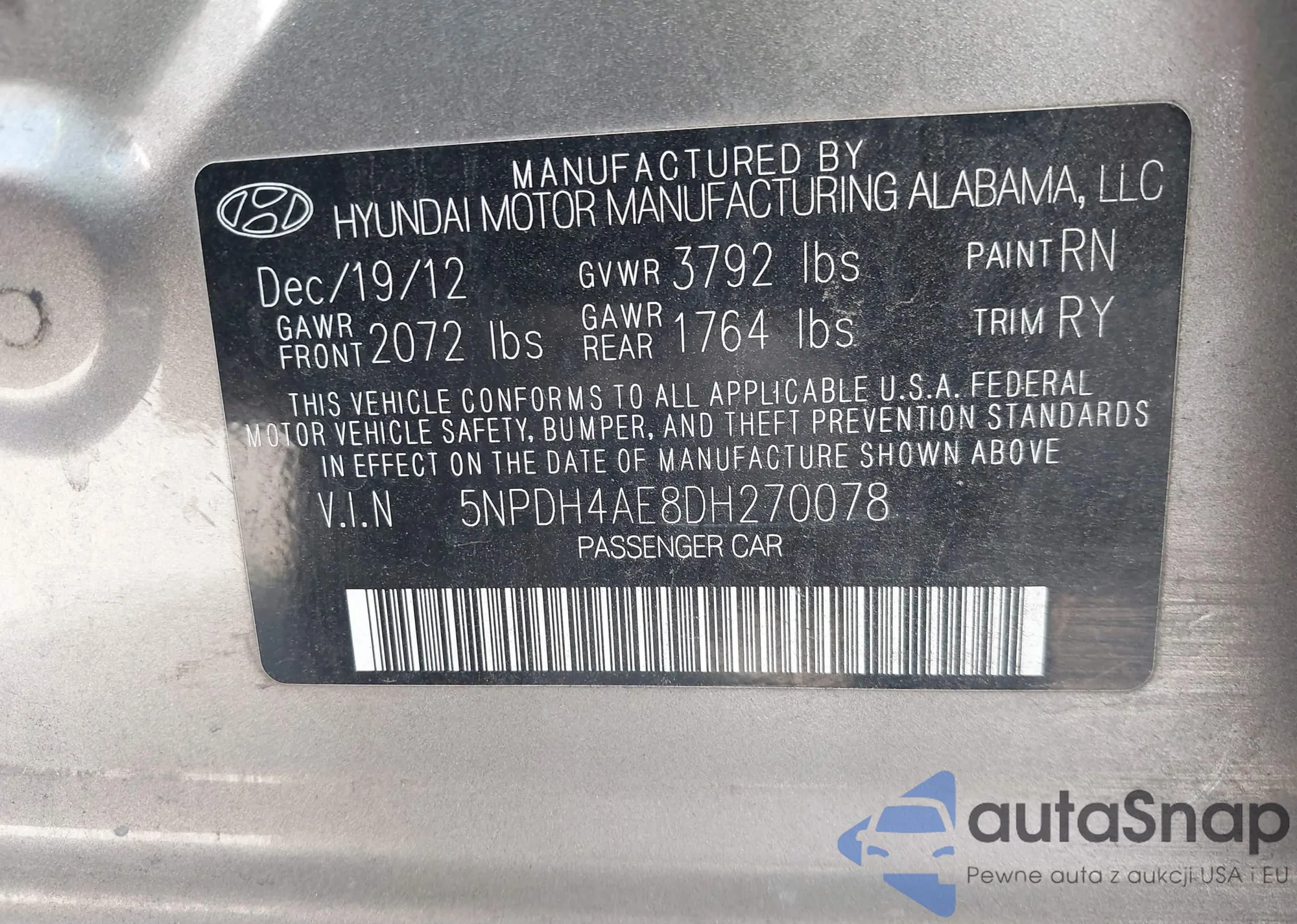 LOT: 43197512 VIN: 5NPDH4AE8DH270078