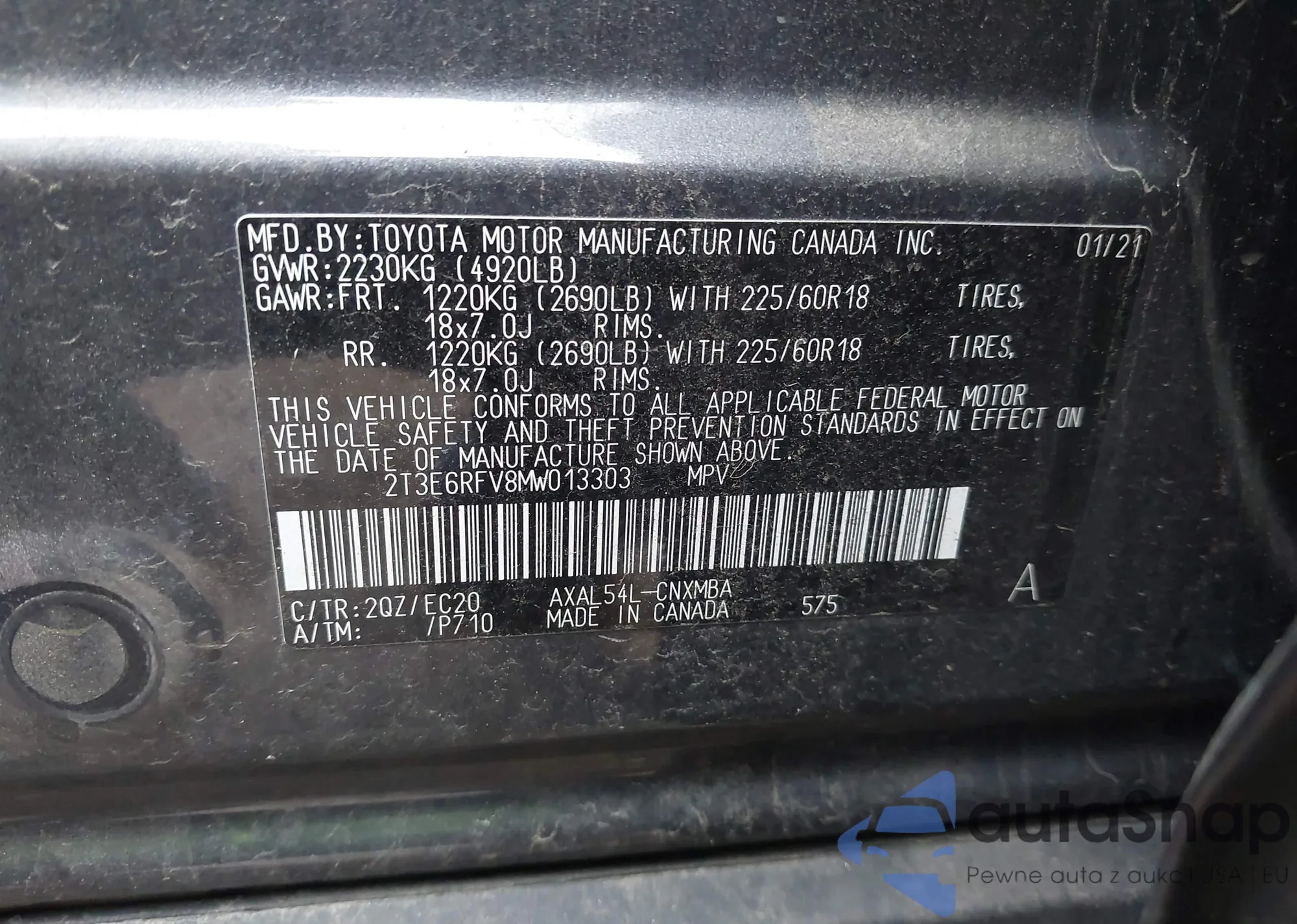 • VIN 2T3E6RFV8MW013303