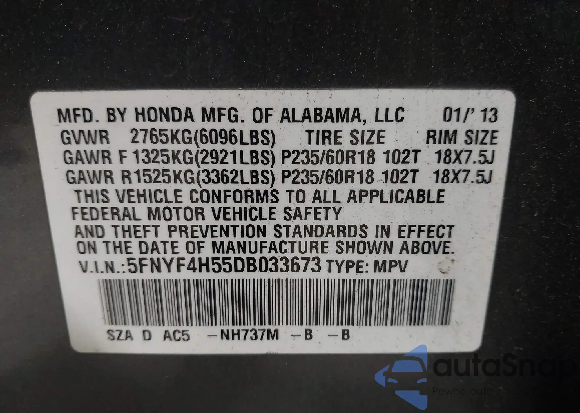• VIN 5FNYF4H55DB033673
