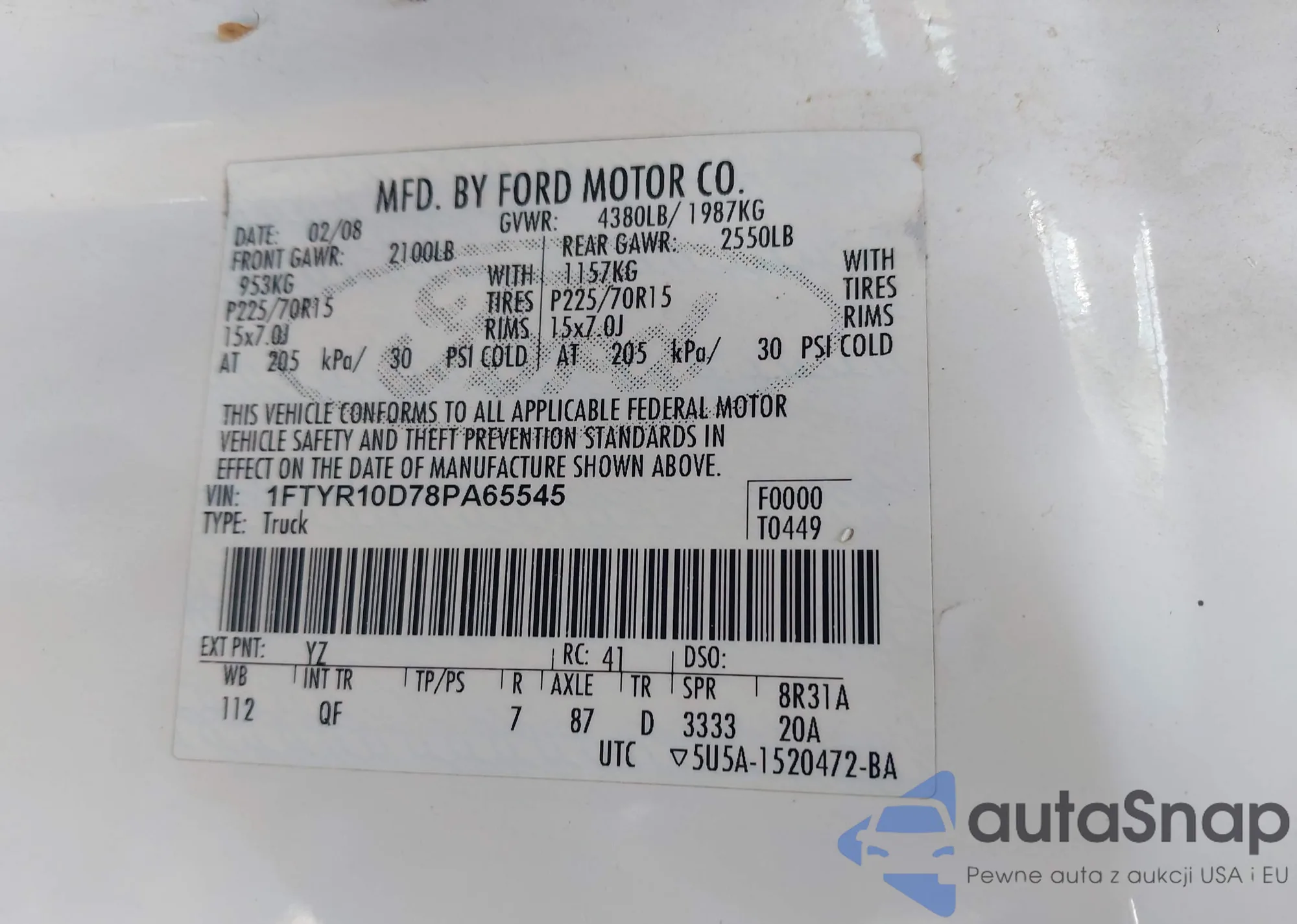 LOT: 42990216 VIN: 1FTYR10D78PA65545