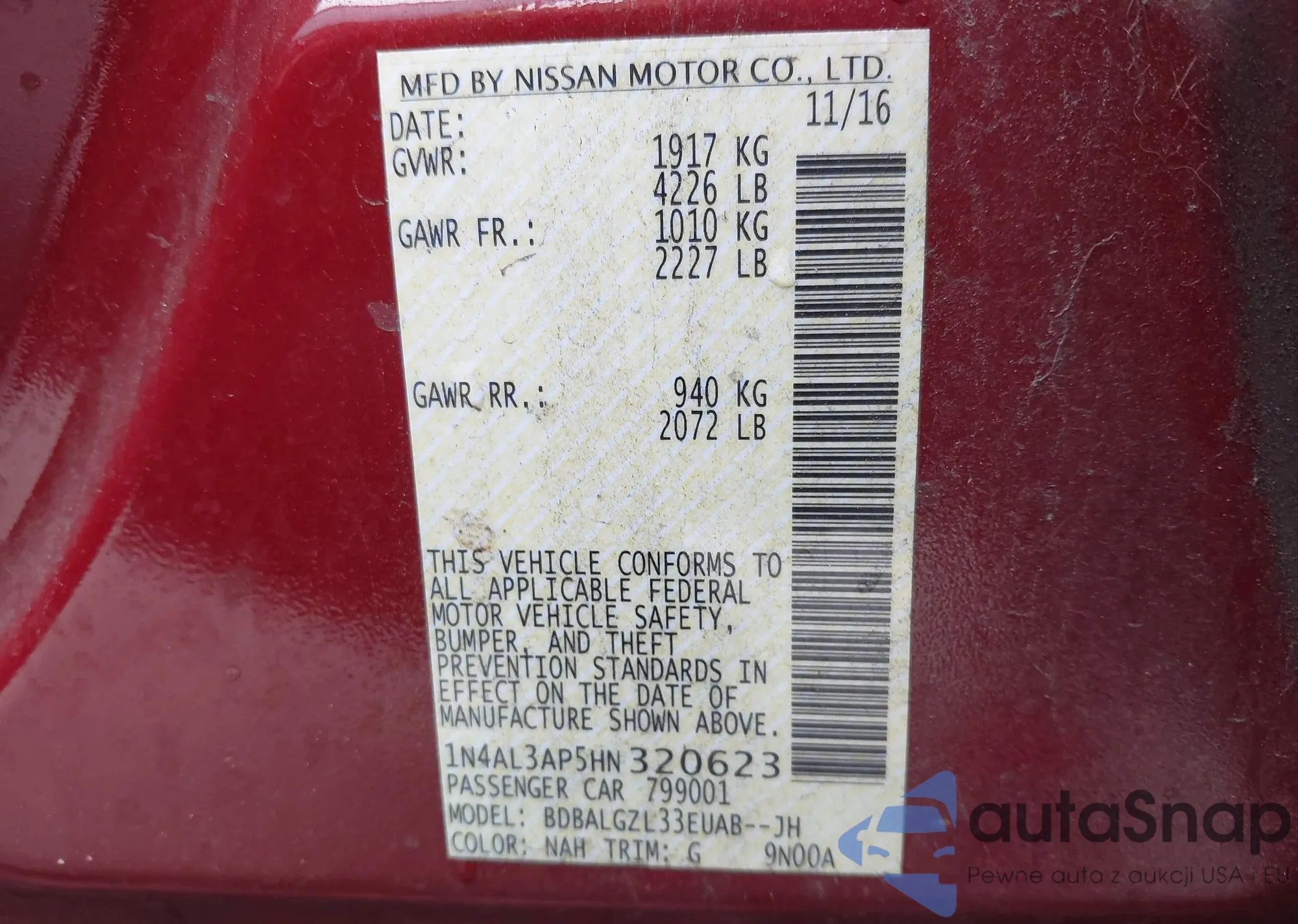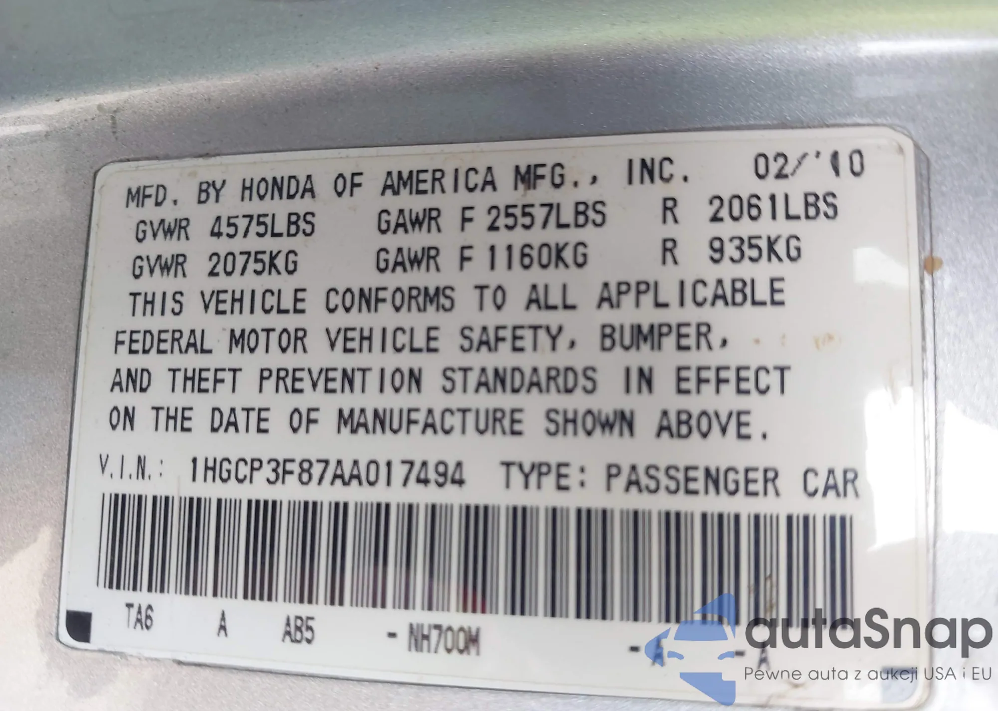 • VIN 1HGCP3F87AA017494