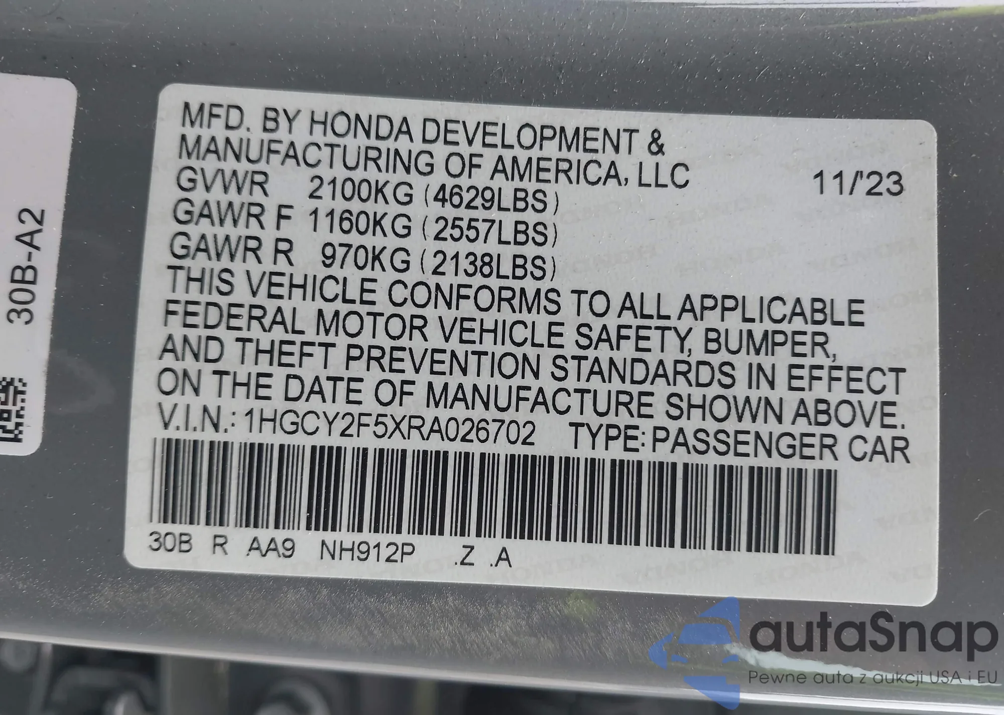 • VIN 1HGCY2F5XRA026702