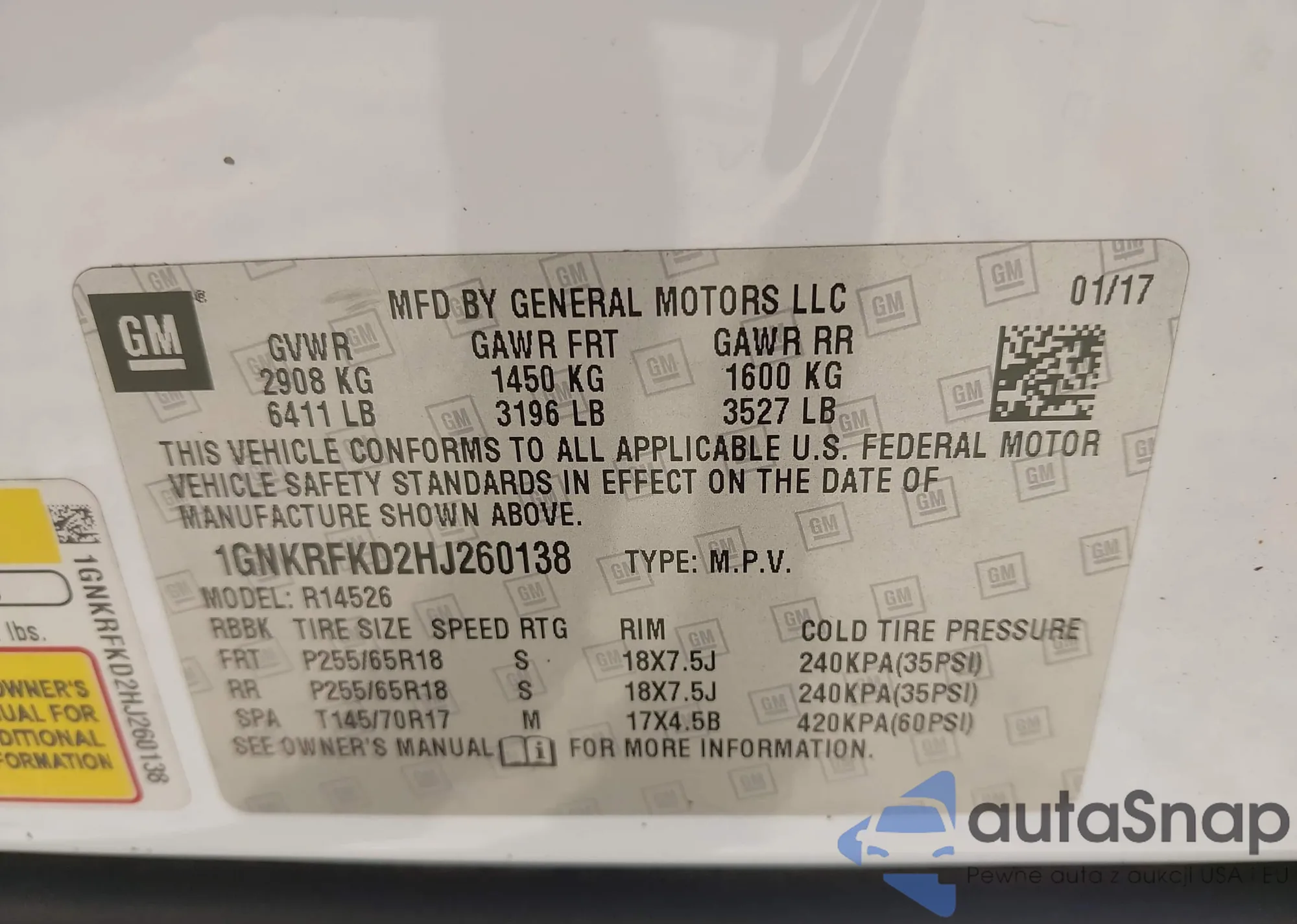 LOT: 43365257 VIN: 1GNKRFKD2HJ260138