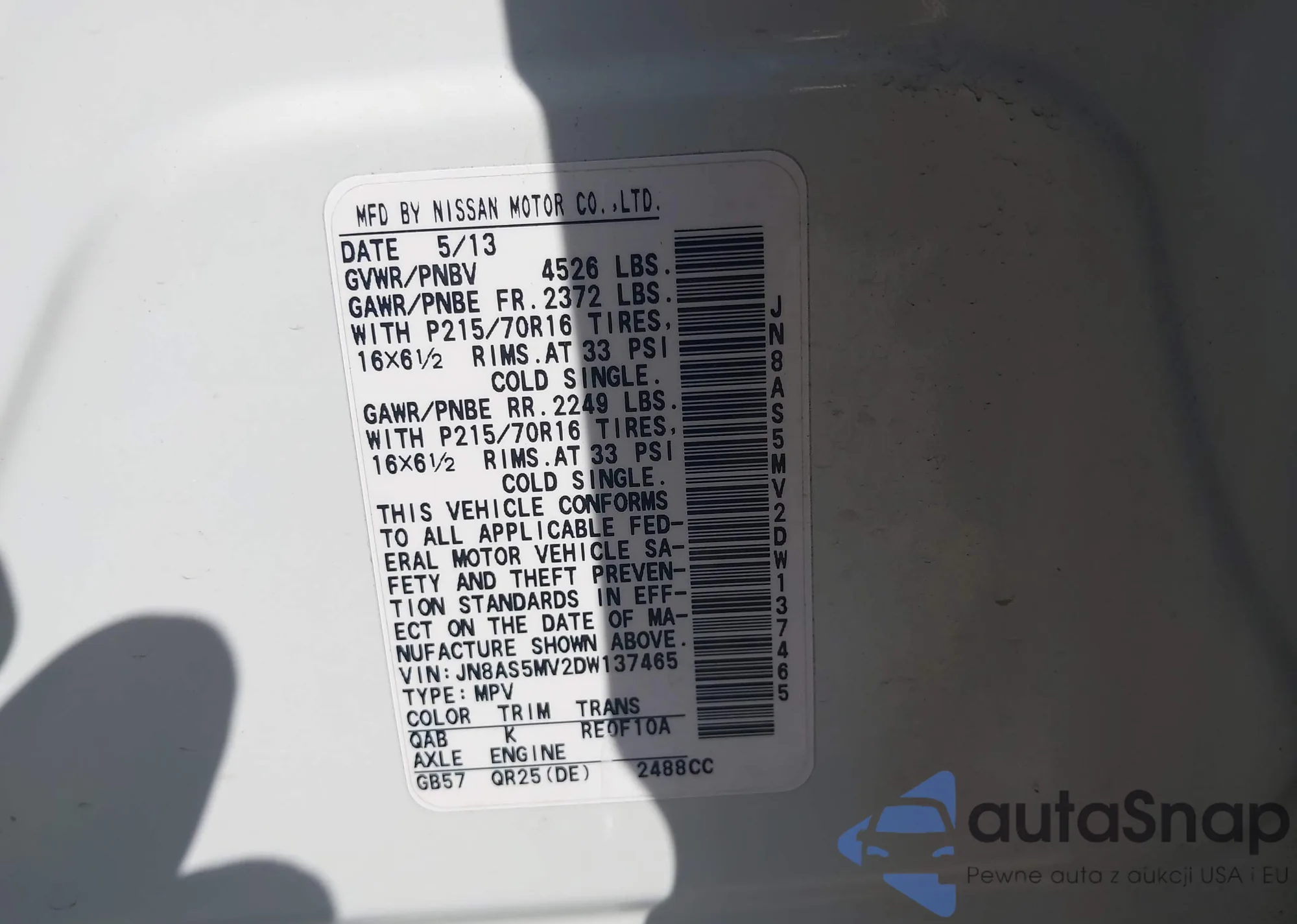 LOT: 43377105 VIN: JN8AS5MV2DW137465